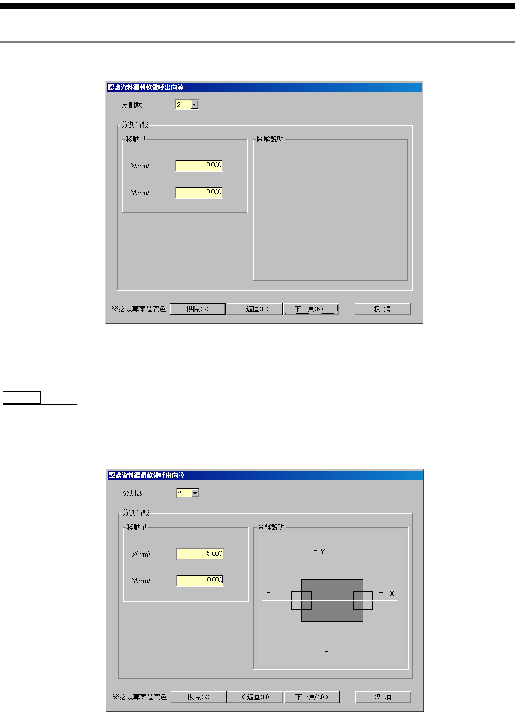零件认识资料制作篇 第 1 章 操作 1-10 SI-F130AI/ SI-F209 2.4 分割信息输入 画面 图 2.4.- 1 分割情報 ( 分割信息 ) 输入 画面 分割數 ( ) 2 4 移動量 X Y ( X Y) 2 3 �…