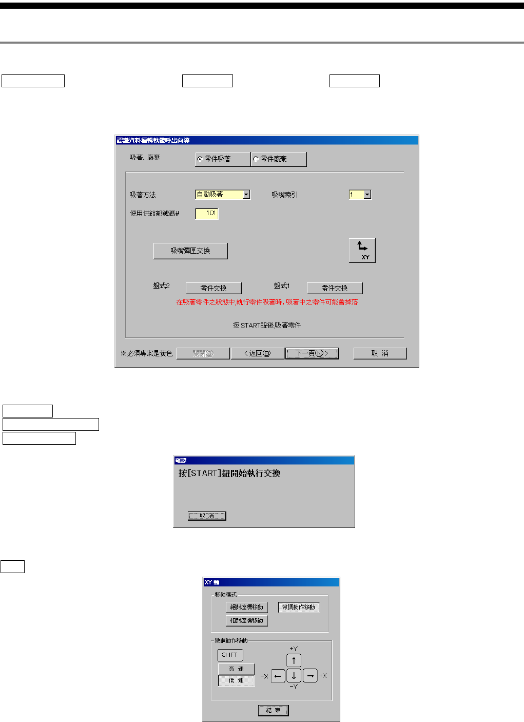 零件认识资料制作篇 第 1 章 操作 SI-F130AI /SI-F209 1-17 2.6 吸着·废弃操作画面 吸著 廢棄 ( ) 零件吸著 ( ) 零件廢棄 ( ) 2.6.1 零件吸着·供料器吸着的情况 图 2.6. 1-1 零件吸著‧ 供料器吸著 ( 零件吸着·供 料器吸着 ) 画面 吸嘴索引 ( …