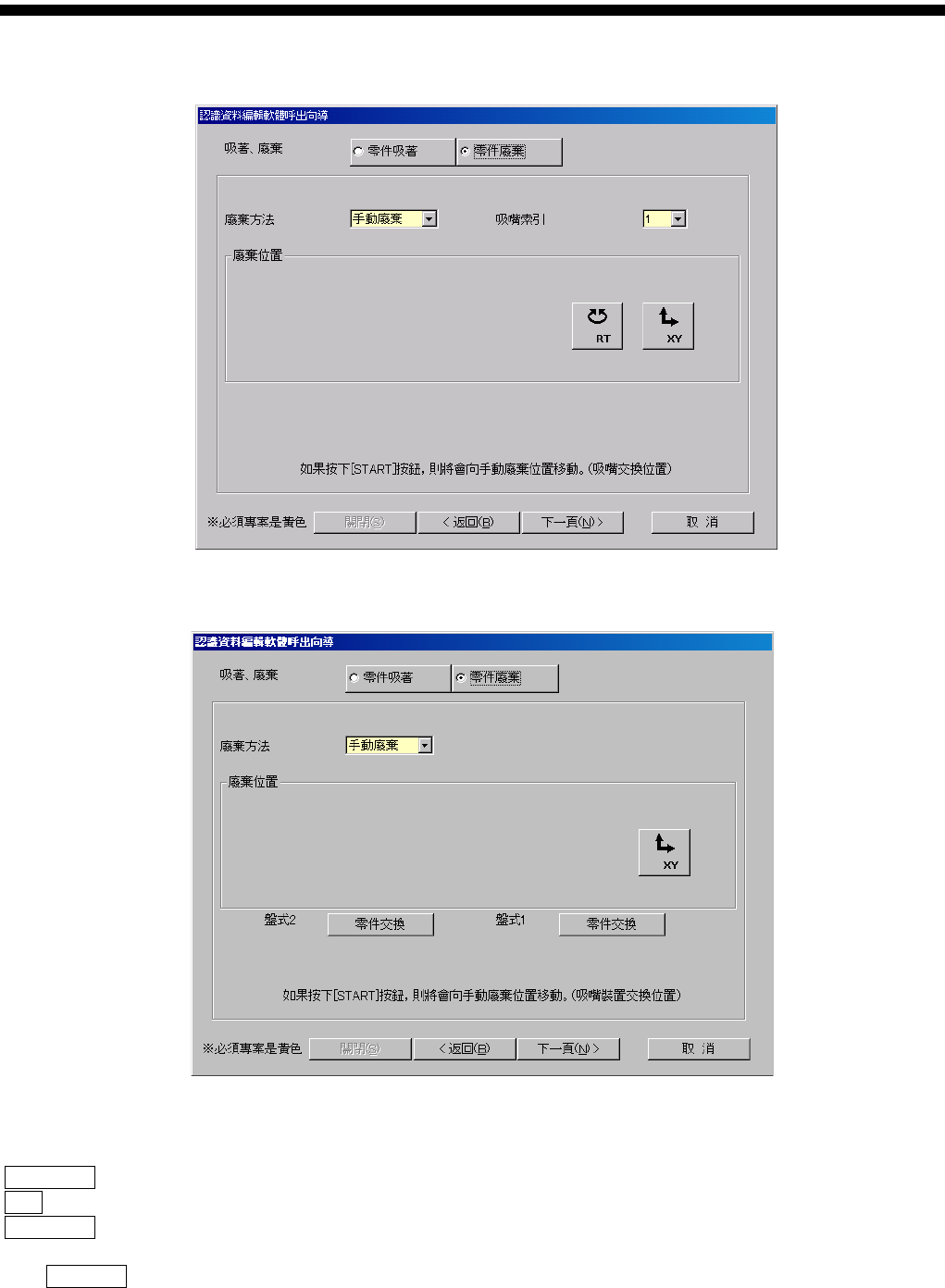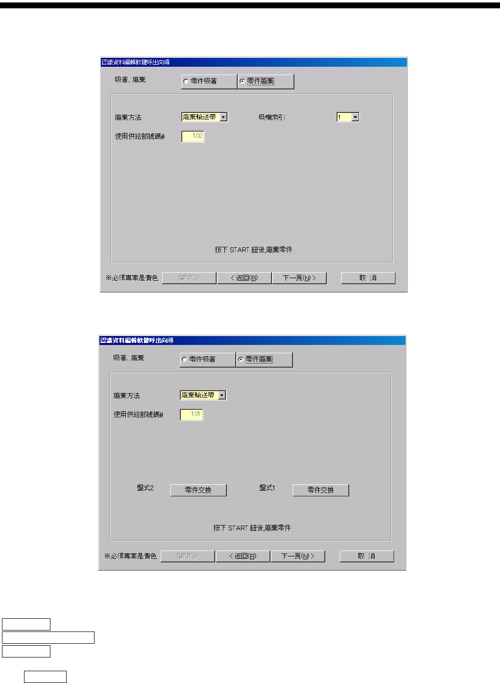 零件认识资料制作篇 第 1 章 操作 SI-F130AI /SI-F209 1-21 2.6.5 零件废弃·废弃输送带的情况 图 2.6.5- 1 零件廢棄 ‧廢棄輸送帶 ( 零件废弃 ·废弃输送带 ) (SI-F130A I) 图 2.6.5- 2 零件廢棄‧ 廢棄輸送帶 ( 零件废弃· 废弃输送带 ) (SI -F209) 吸嘴索引 ( ) SI-F13 0AI 使用供…