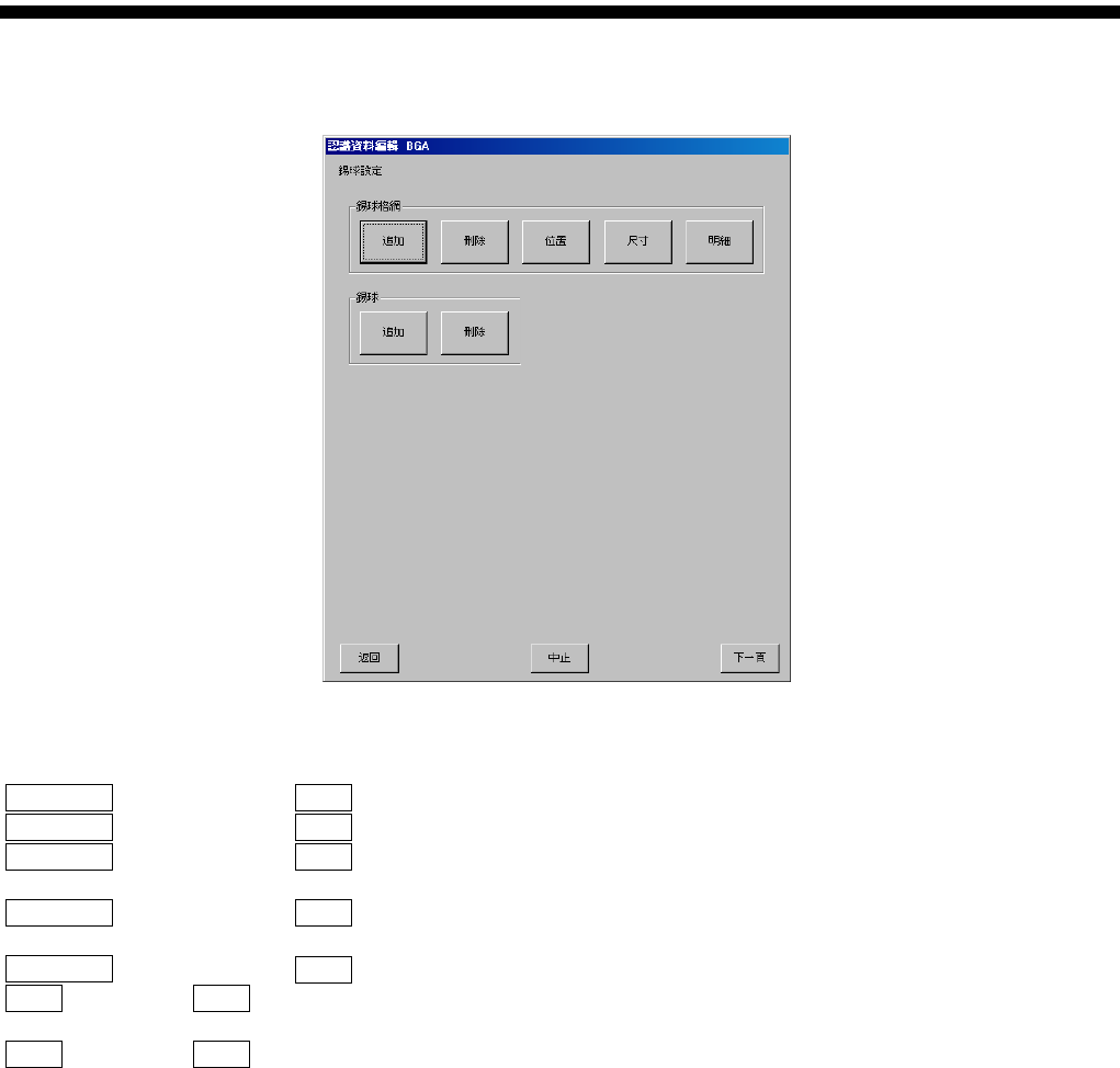 零件认识资料制作篇 第 1 章 操作 SI-F130AI /SI-F209 1-35 3.4.6 锡球设定画面 图 3.4.5 -3 錫球設定 ( 锡球设定 ) 画面 錫球格網 ( ) 追加 ( ) 錫球格網 ( ) 刪除 ( ) 錫球格網 ( ) …