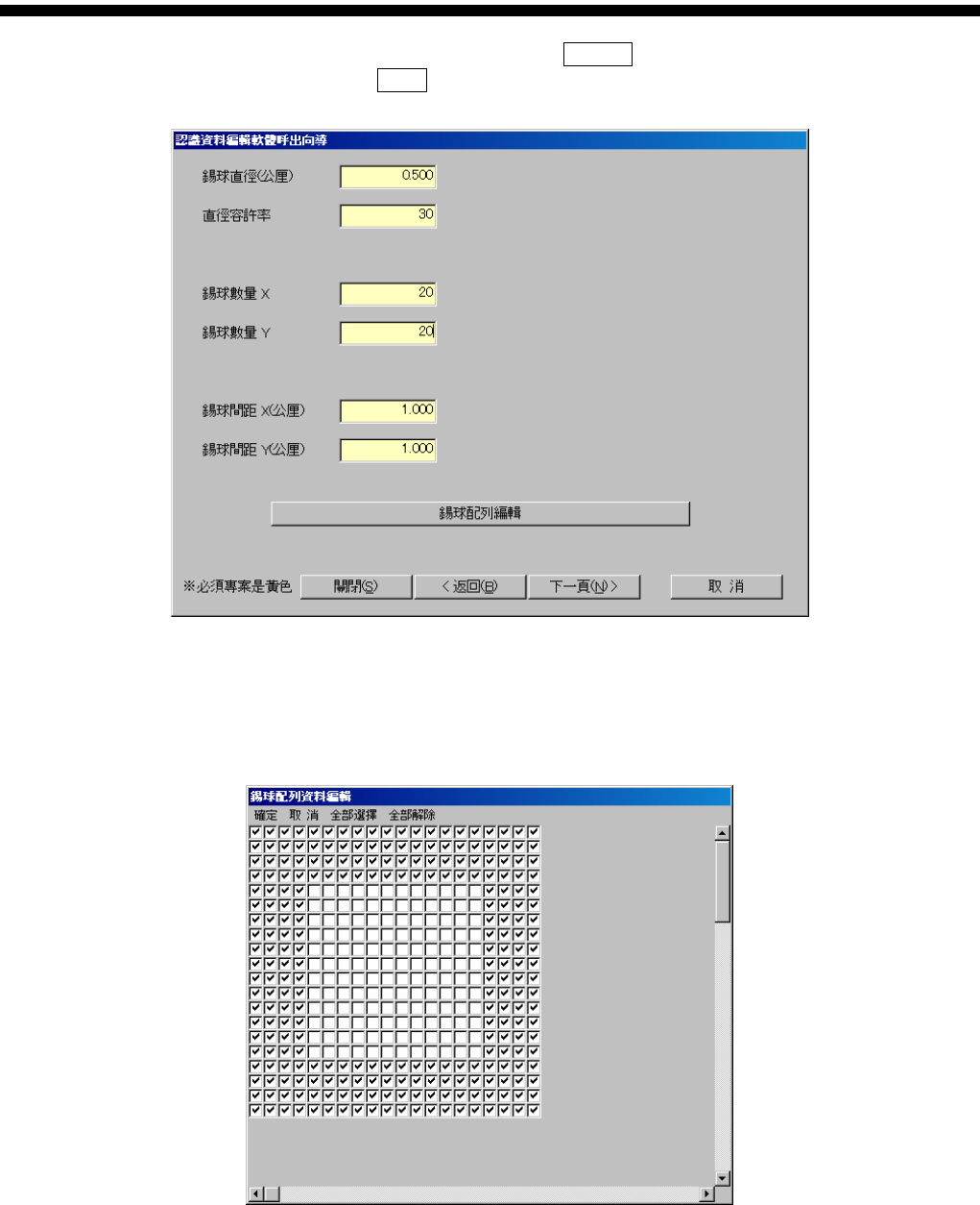 零件认识资料制作篇 第 2 章 顺序 2-28 SI-F130AI/ SI-F209 下一頁 ( ) 關閉 ( ) 图 1.5-2 錫球 ( 锡球 ) 信息输入 画面 图 1.5-3 錫球 ( 锡球 ) 数组输入 画面