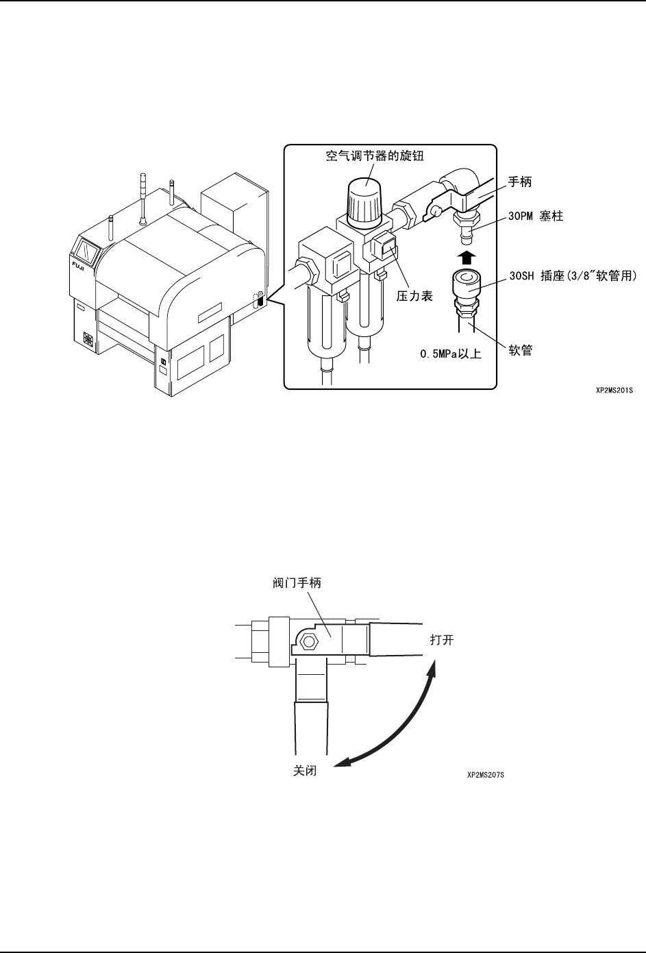 把外部压缩空气供应管接到主机上,并用调节器调整到规定的空气压力 (0.5 M Pa)。