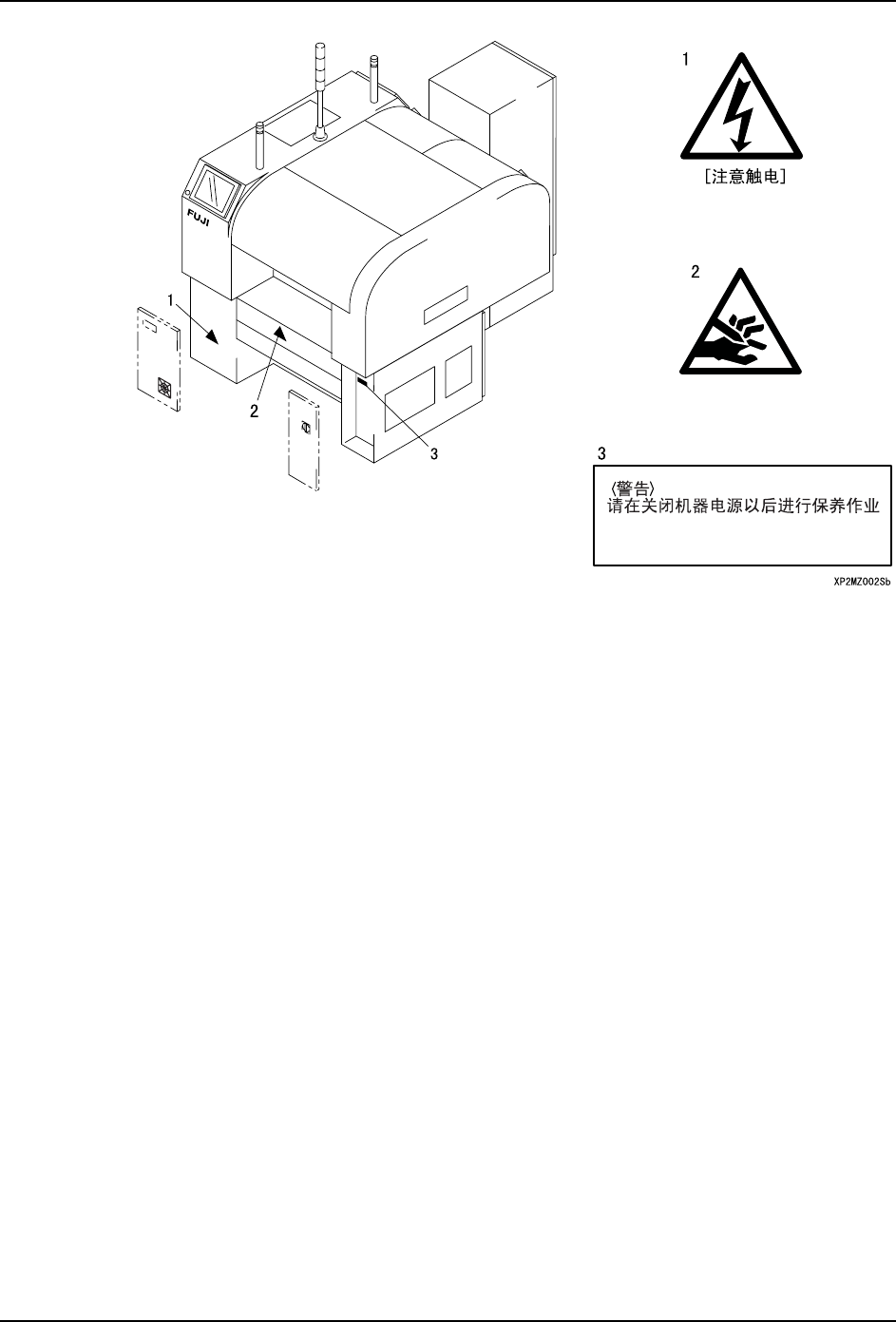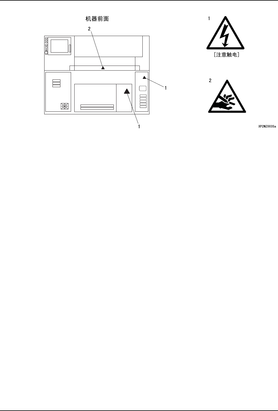 表示使用机器时的注意事项的标示牌贴在本机器的如下图所示的位置,请仔细阅读,确保安