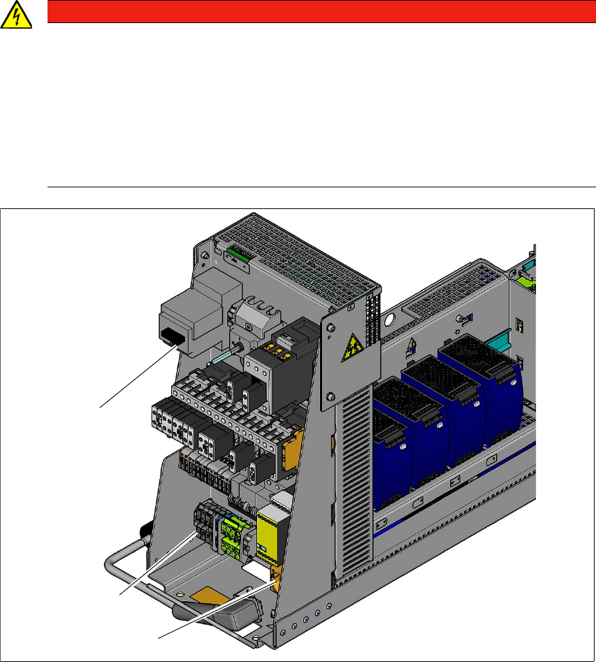 – 主电源开关 Q1 变压器单元中的主连接终端 L1、L2、和 L3