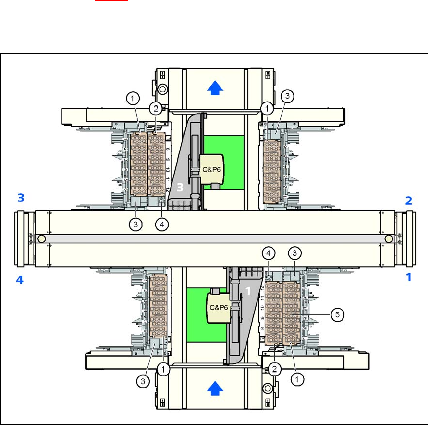 6 Station extensions User Manual SIPLACE X-Series 6.1 Nozzle changer From software version SR.605.xx 07/2008 EN Edition 390 6.1.3.4 Position of the nozzle changers for t he C&P6 head on the X3 machine 1 or 2 nozzle c…