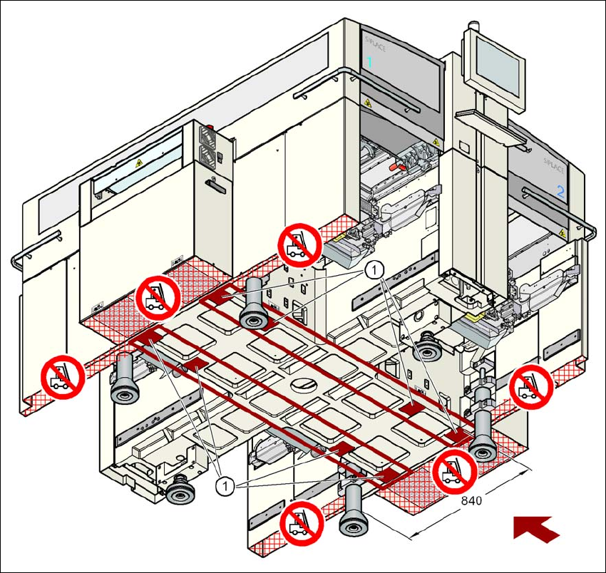 Aufstellen und Inbetriebnahme Betriebsanleitung SIPLACE X-Serie Transport und Anlieferungskonfiguration Ab Softwareversion SR.70x.xx Ausgabe 01/2011 216 Gabel quer zum Leiterplattentransport 4 4 Abb. 4.1 - 4 Auflagefläch…