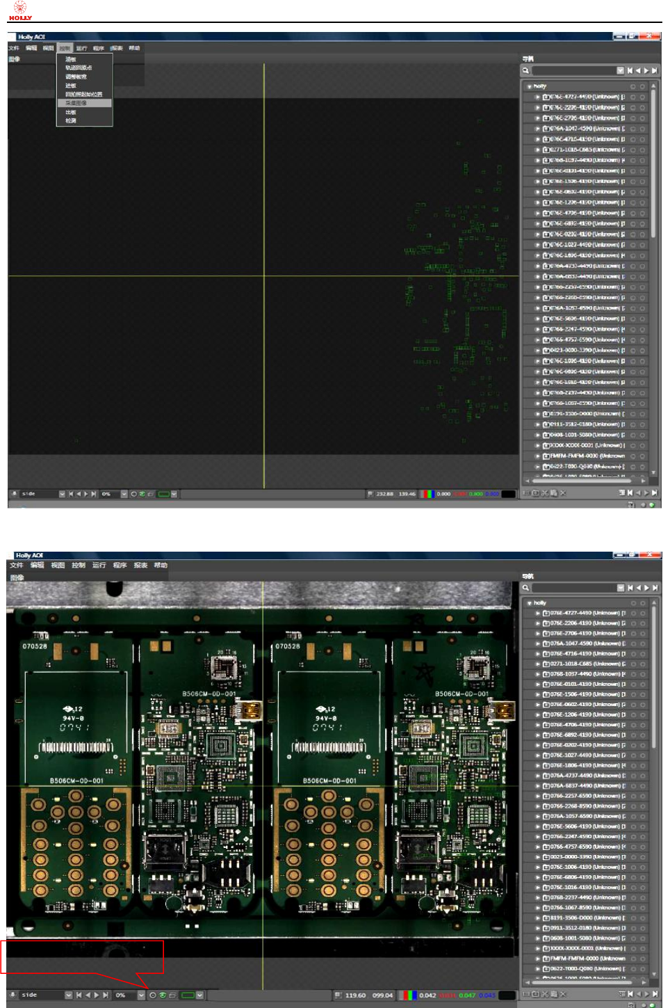 步骤 3):赫立 AOI 自动获取待测 PCB 整板图像,建议居中放置(点击界面左下方的“居中”功能按钮)
