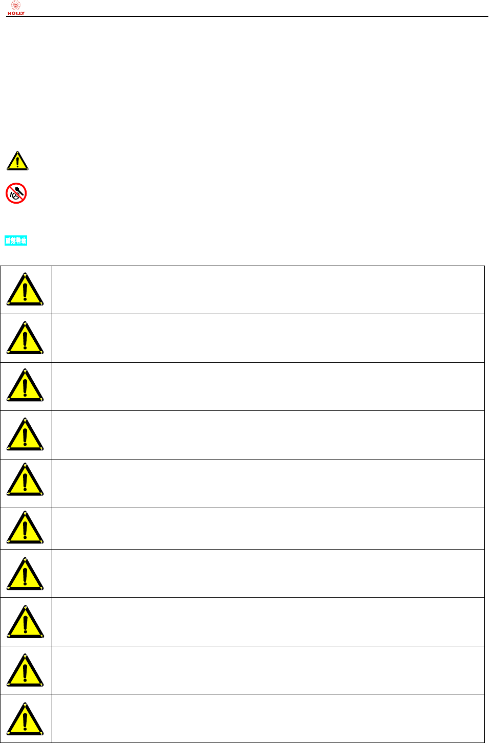 警告标志:警告使用者注意危险的标志。忽略该标志提示或者违反操作规程可能导致人员伤亡。