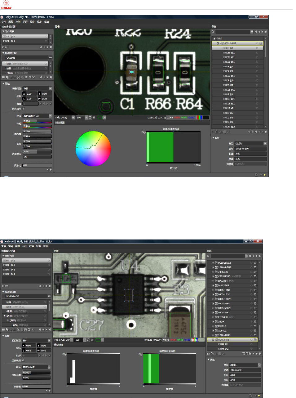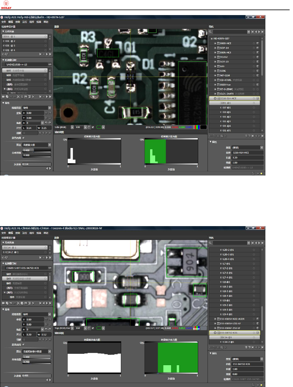 上海赫立电子 科技有限公司 在线型自动光 学检测仪使用 手册 第 52 页 共 64 页 在 Sid e (RGB) 真 彩色图像模式 下: 当 二极管 D 1 未缺件时, 本体相对较 暗, 亮 度最大值相对 较小;当元 件缺件时,元 件本体下的白 色高亮丝 印便裸露出来 ,亮度最 大值则相对较 大。 d) 缺件检 测方法 之 亮 度投 射最小 跨度 在 T op (RGB) Dark 图 像模式下:当 电容 C14 未 缺件时 ,基板…