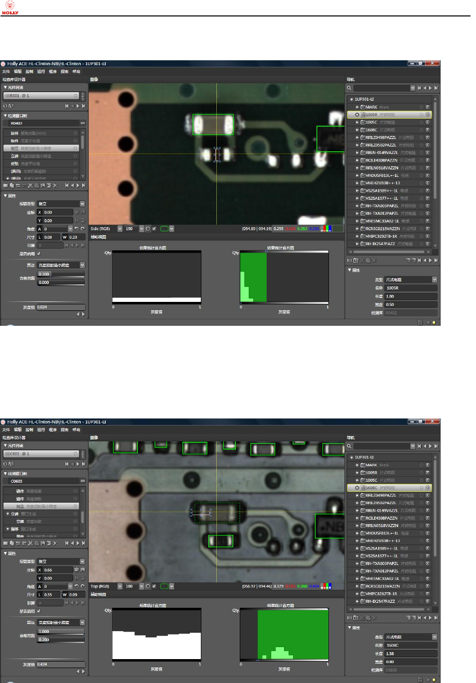 上海赫立电子 科技有限公司 在线型自动光 学检测仪使用 手册 第 56 页 共 64 页 5-4-3. 侧立 a) 侧立检 测方法 之 亮 度投 射最小 跨度 1 在 Sid e ( RGB ) 真彩色图像 模式下: 当电阻元件 没有侧立时 , 当前窗 口没有任 何的亮边横 向贯穿 , 结果 数值相对较 小;当电阻元件侧立时,电阻的 侧向亮边就会 横向贯穿当前 检测窗口,亮度投 射最小跨度的 结果值则相对 较大。 b) 侧立检 测方法 …