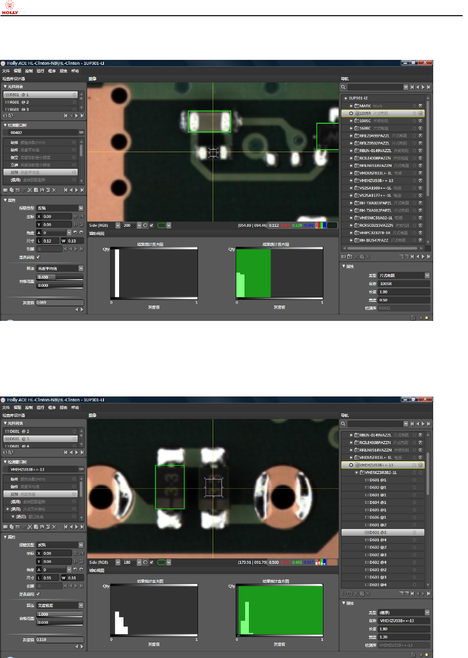上海赫立电子 科技有限公司 在线型自动光 学检测仪使用 手册 第 59 页 共 64 页 5-4-6. 错件 a) 错件检 测方法 之 亮 度抽 取 在 Sid e ( RGB ) 真彩色图像 模式下: 电容元件未 错贴成电阻元 件时, 本体表面亮 度均匀且很亮 , 当前检 测窗口位置亮 度很暗的像素 数占窗口 内像素总数的 比例非常 少; 而当元件错贴 成电阻元件时 , 电阻 元件 本体较暗,导 致亮度抽取亮 度很暗的 像素数占窗口 …