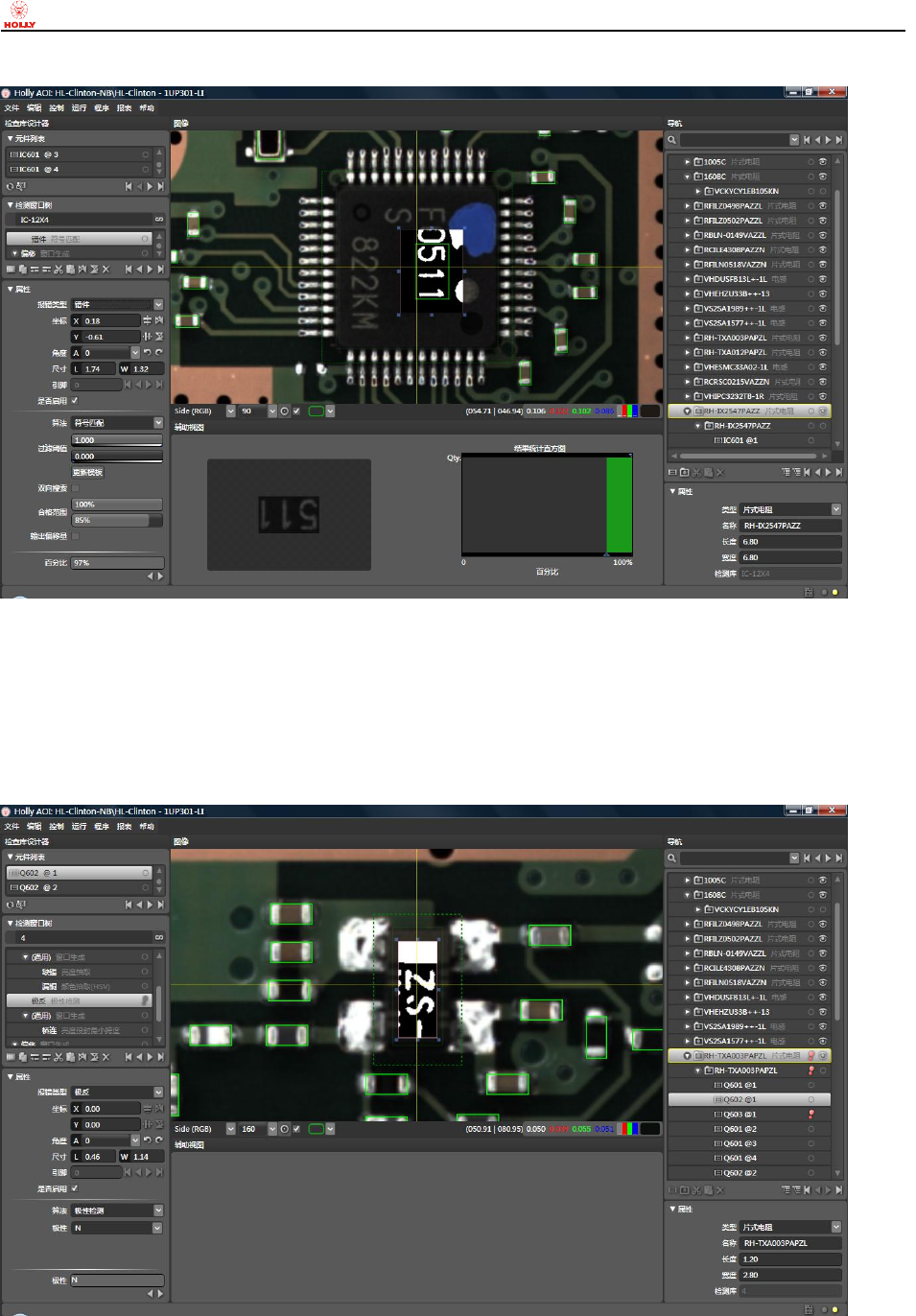 当前检测窗口为例,二极管未极反时,极性结果数值显示为 N;而当二极管贴片极反时,极性结果数值