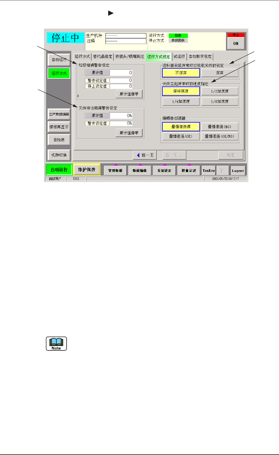 开始生产运行之前,先进入 “ 运行方式 ” 子菜单界面,就生产机种的