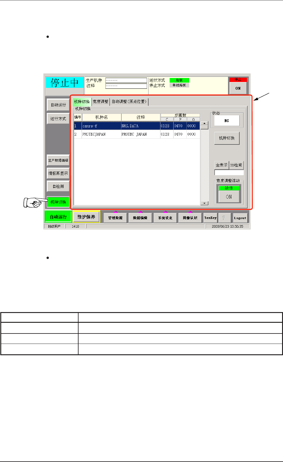 7 . 1 7 . 1 7 . 1 7 . 1 7 . 1 “ 机 种 切 换 机 种 切 换 机 种 切 换 机 种 切 换 机 种 切 换 ” T a b T a b T a b T a b T a b 切 换 进 行 自 动 运 行 的 机 种 ( 线 路 板 程 序 ) 。 页 面 显 示 页 面 显 示 页 面 显 示 页 面 显 示 页 面 显 示 在 “ 机 种 切 换 ” 子 菜 单 界 面 中, 按 下 [ 机 种 切…