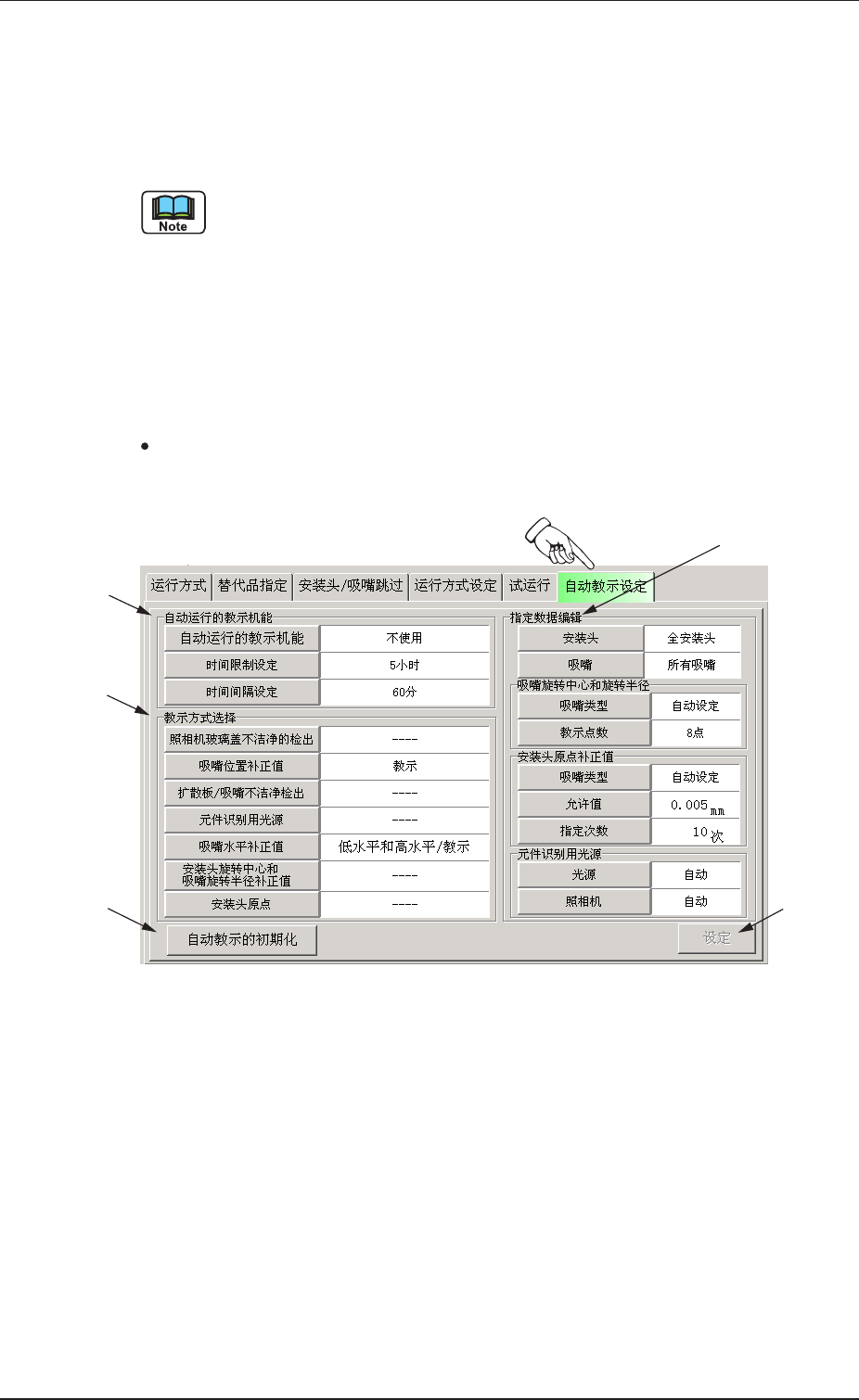 3 . 6 3 . 6 3 . 6 3 . 6 3 . 6 “ 自 动 教 示 设 定 自 动 教 示 设 定 自 动 教 示 设 定 自 动 教 示 设 定 自 动 教 示 设 定 ” T a b T a b T a b T a b T a b 通 过 在 自 动 运 行 过 程 中 实 行 教 示 , 可 进 行 稳 定 的 元 件 吸 取 以 及 元 件 贴 装 。 ( a ) 自 动 运 行 的 教 示 机 能 , 管 理 装 …