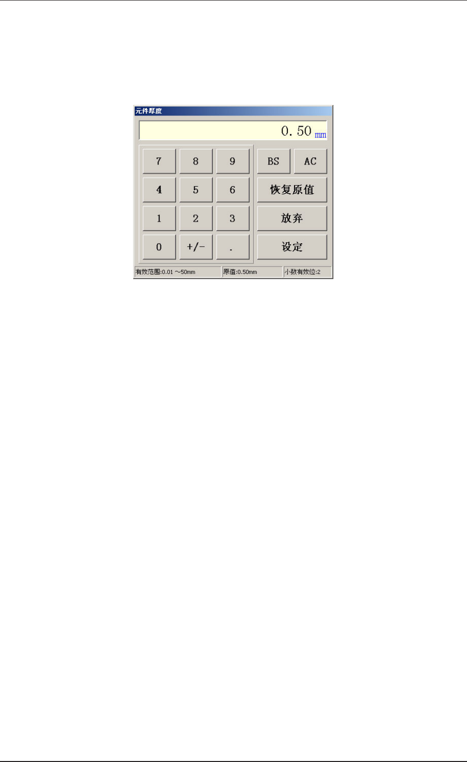 显 示 部 显 示 有 当 前 元 件 厚 度 t 的 值 。 要 变 更 元 件 厚 度 t 的 时 候 , 可 按 [ 变 更 ] 按 钮 , 显 示 如 下 编 辑 界 面 。 F i g . 2 E 3 7 F i g . 2 E 3 7 F i g . 2 E 3 7 F i g . 2 E 3 7 F i g . 2 E 3 7 “ 元 件 厚 度 元 件 厚 度 元 件 厚 度 元 件 厚 度 元 件 厚 度 t t t …