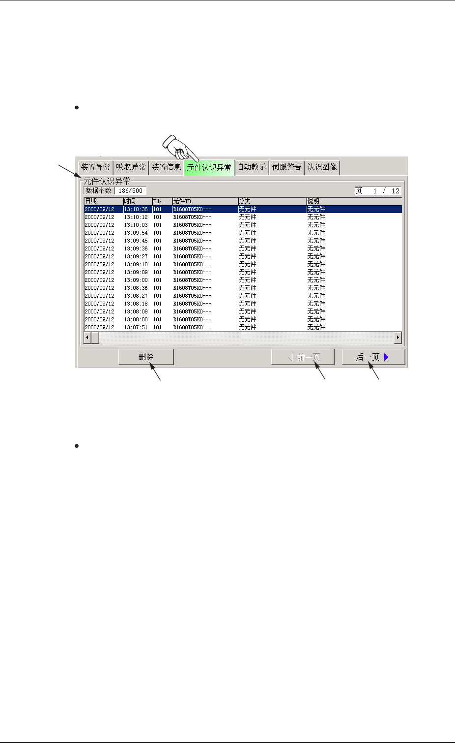显示发生元件认识异常的日期和时间、送料器编号、认识异常编号