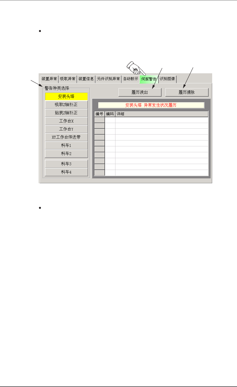 在 “ 情报再显示 ” 子菜单界面中,按下[ 伺服警告] T a b 时,将显示