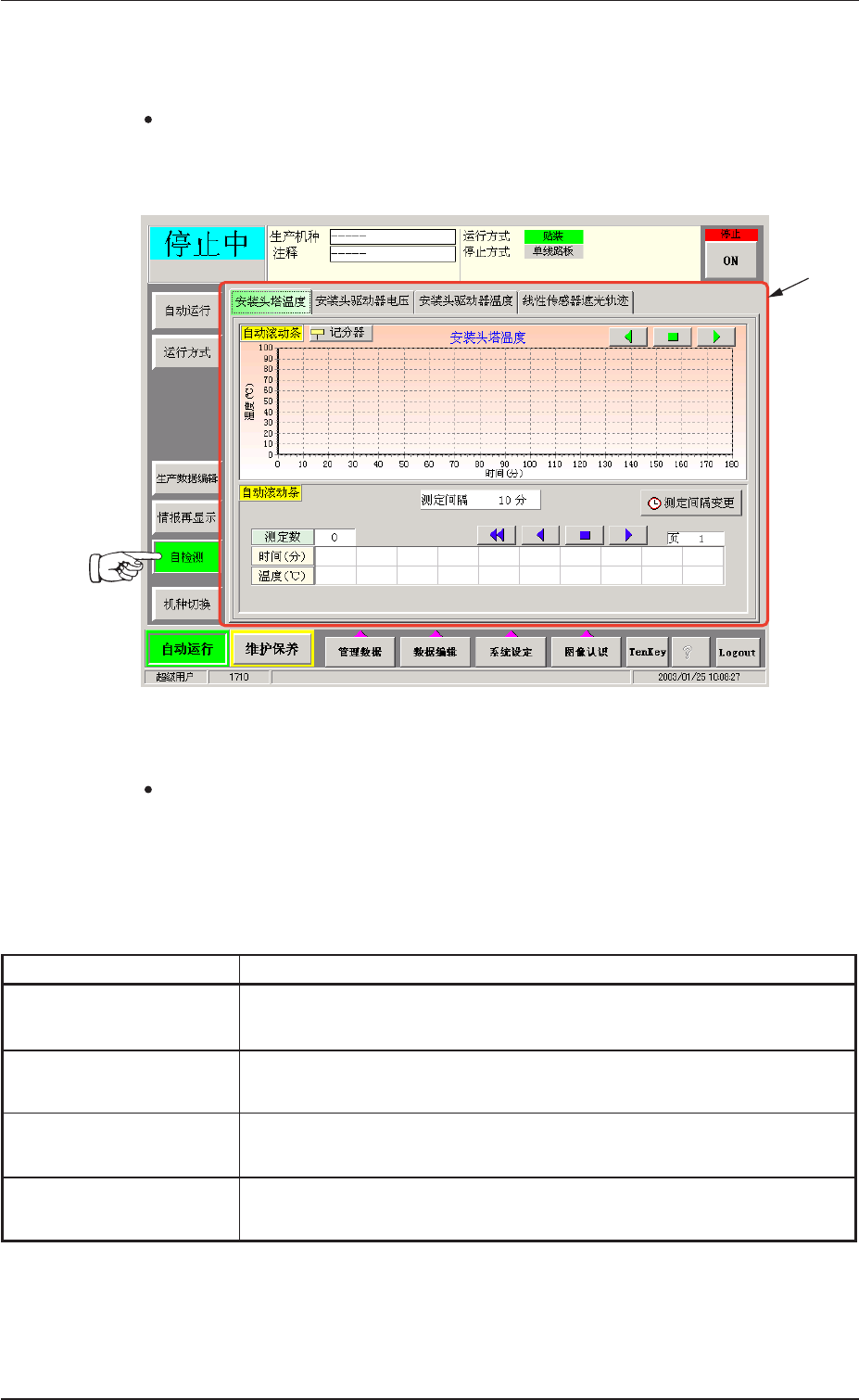 在 “ 自检测 ” 子菜单界面中,按下[ 安装头塔温度] T a b 时,将显示