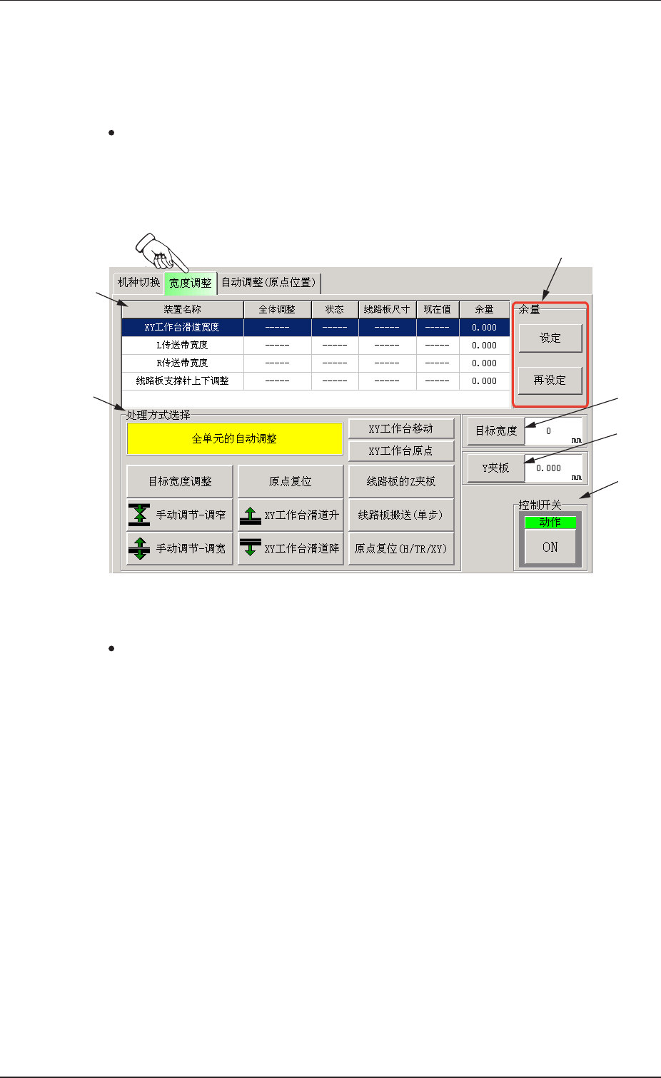 状 态 状 态 状 态 状 态 状 态 : : : : : 按 * 4 * 4 * 4 * 4 * 4 的 动 作 [ O N ] 按 钮 , 开 始 做 宽 度 调 整 , 显 示 单 位 状 态 。 “ 完 毕 完 毕 完 毕 完 毕 完 毕 ” : : : : : 宽 度 调 整 变 更 完 毕 , 装 置 在 “ 线 路 板 尺 寸 ( 宽 ) + 余 量 ” 的 位 置 。 “ 不 定 不 定 不 定 不 定 不 定 ” : …