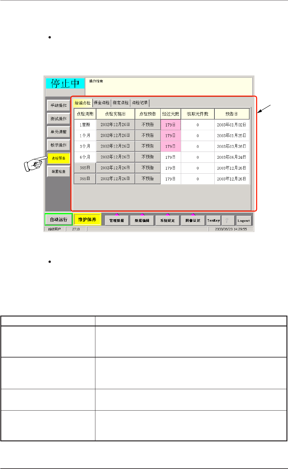 按下维护保养子菜单栏的[ 点检预告] 按钮时,将显示如下子菜单界