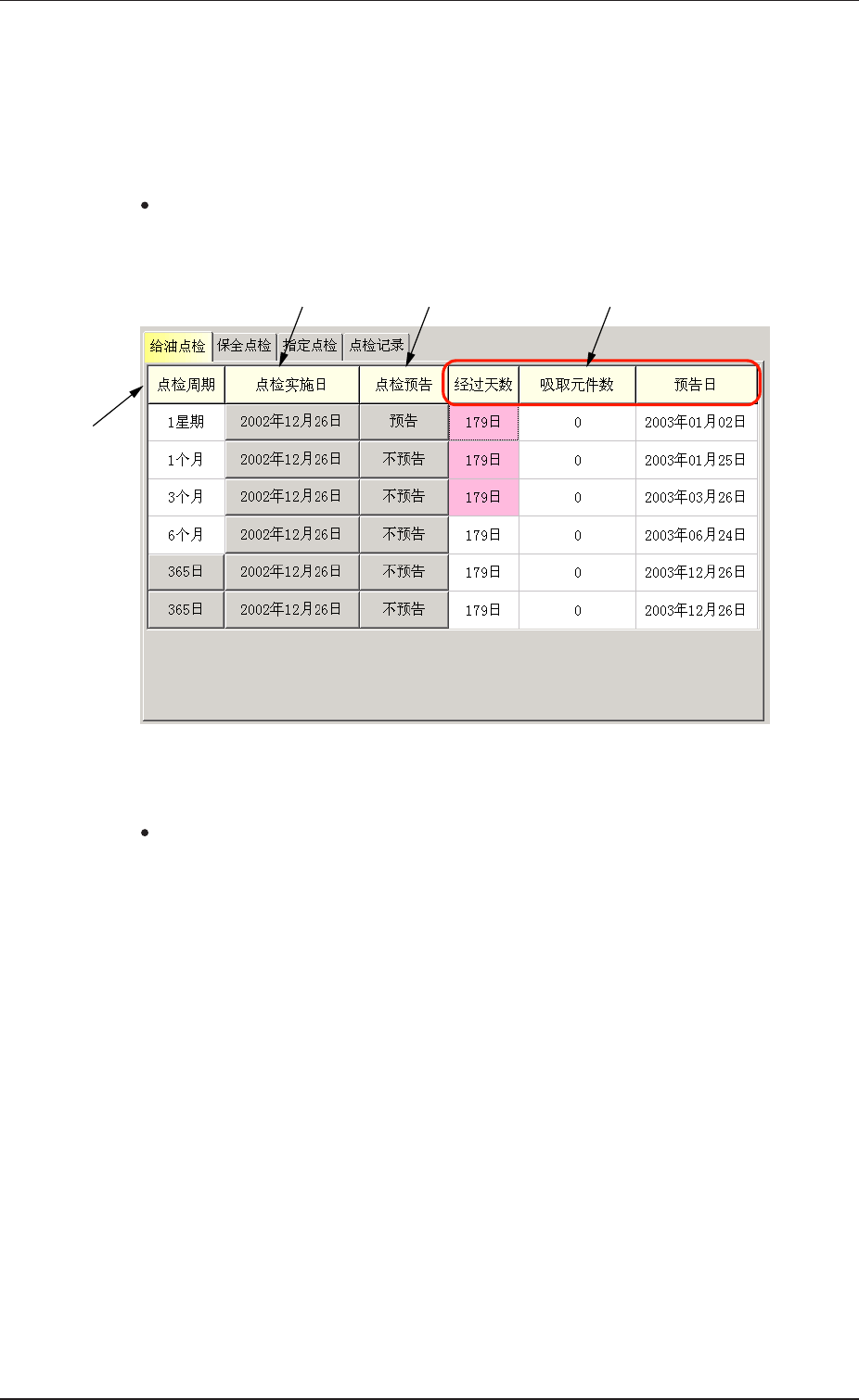 在 “ 点检预告 ” 子菜单界面中,按[ 给油点检] T a b 时,将显示如下