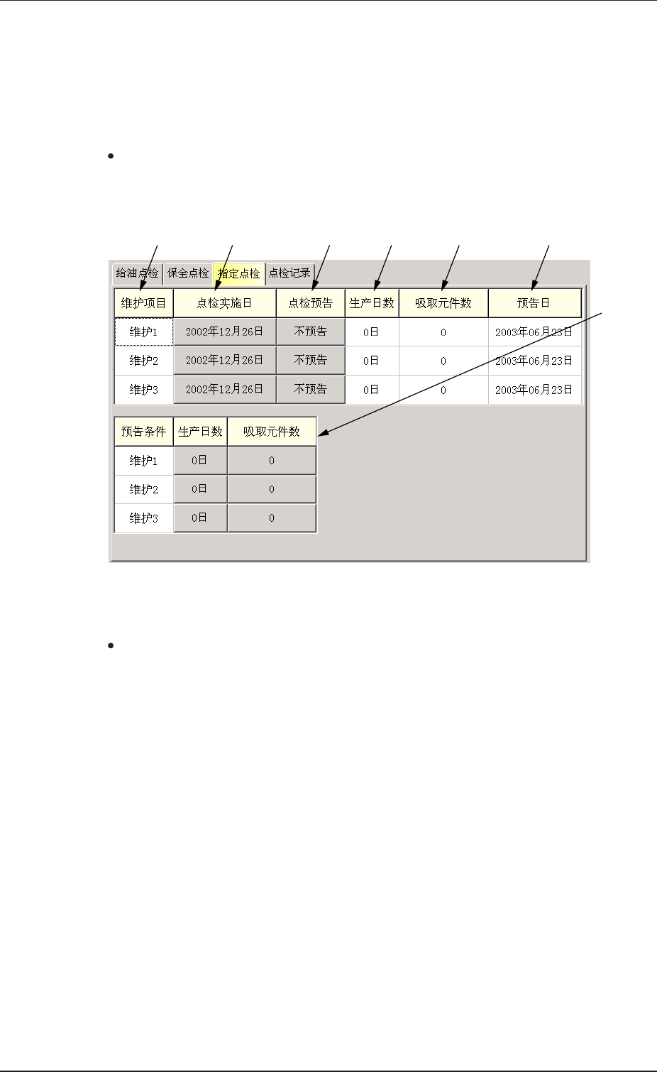 6 . 3 6 . 3 6 . 3 6 . 3 6 . 3 “ 指 定 点 检 指 定 点 检 指 定 点 检 指 定 点 检 指 定 点 检 ” T a b T a b T a b T a b T a b 最 大 可 添 加 3 项 保 修 点 检 项 目 ( 维 护 1 、 维 护 2 、 维 护 3 ) , 进 行 装 置 点 检 预 告 。 页 面 显 示 页 面 显 示 页 面 显 示 页 面 显 示 页 面 显 示 在 “ …
