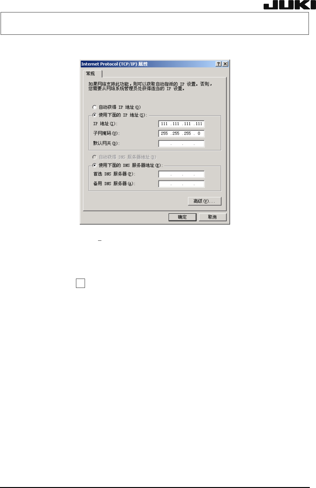 保养调整说明书 5) 于是显示[Internet Protocol (TCP/IP) 属性]的的对话框。 选择 “ 使用下面的IP地址 ( S) ” ,输入[IP地址]和[子网掩码]。 关于 IP 地址, 如果公司 内部有规定, 则按照公 司的网络管理员的指示进行设置。 若无指定, 请设 定号码,但不要用与 HLC 连接的 其他机种已设定的号码 。此处,设置为[111.111.111.111]。 子网掩码处输入[ 255.255.255…