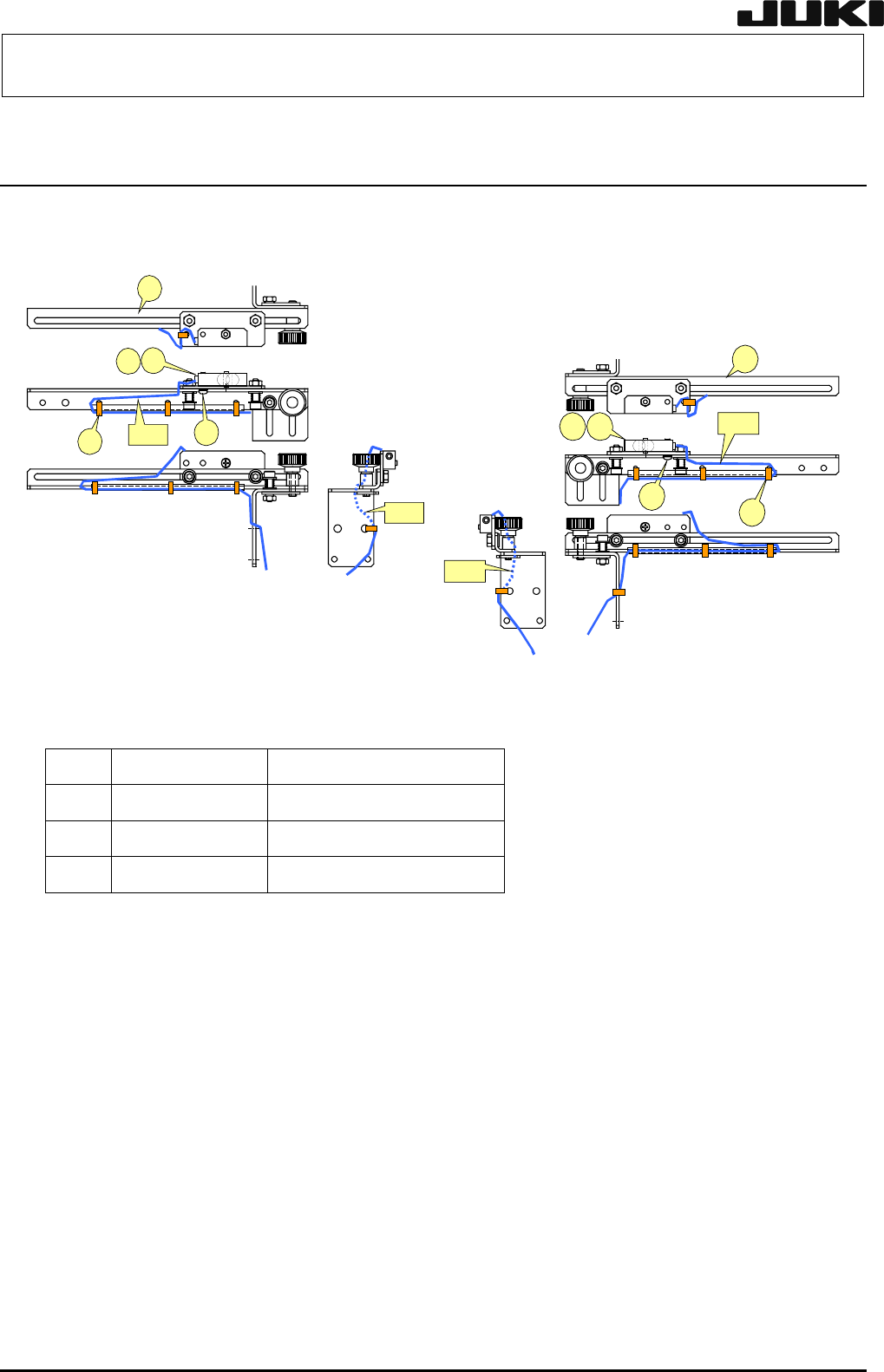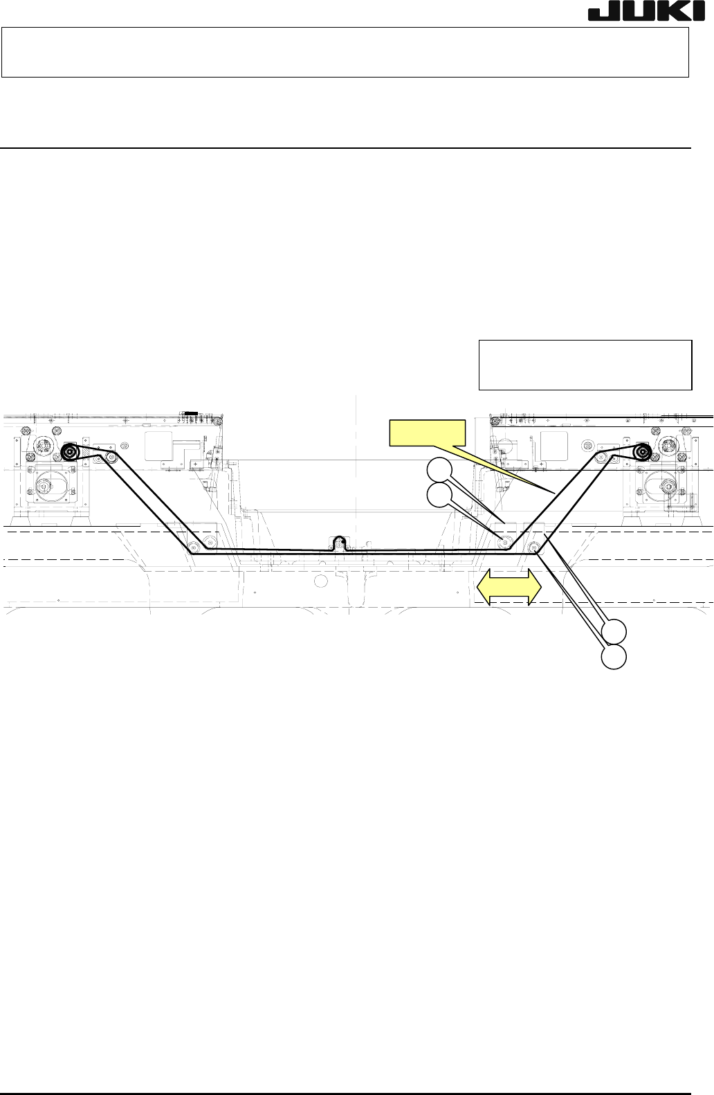 保养调整说明书 5-6 宽度校正连接皮带的调整(IN/OUT) <顺序> 1) 拧松调整支架 R①的支架紧固螺栓,左右移动张力调整皮带轮②和换向皮带轮③。 2) 注意与其它部件的干扰,同时调整皮带张力。 3) 用 UNITTA 制音波式皮带张力计进行张力测量,调整皮带张力为 45±5N。 (Weight=002.5, Width=009.0, Span=0260) 4) 调整后,固定调整支架 R①。 品名:宽度调节链带 L …