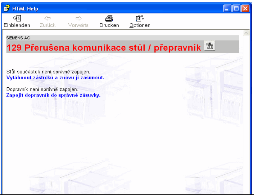 Hlavní okno Systému nápovědy s informacemi o aktuální chybě se otevře (viz příklad