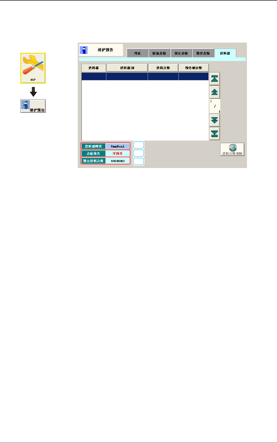 作为维护项目,显示对于送料器 SN 的送料次数和预告剩余数。