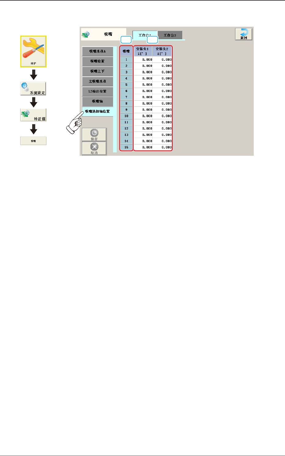 贴装在安装头上的专用吸嘴的下面水准补正值数据。