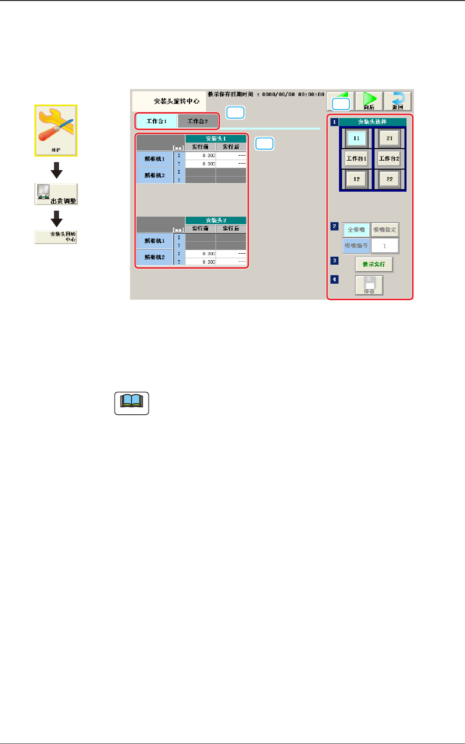 (指定的横梁移动到所定位置,实行安装头旋转角度轴补正值的教示。)