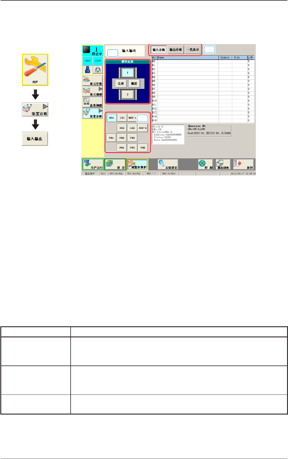 3OM-1732 1-6-2 6.1 输入输出 诊断各部分的输入输出状态。 [1] [2] [3] Fig.3A6-2 [1] 模块选择按钮 在装置的图像中显示的各模块被设为按钮。按下按钮,选择诊断 I/O 状态的模块。 [2] 单元选择按钮 配置有用模块选择按钮选择的模块各单元按钮。 选择诊断 I/O 状态的单元。 [3] [ 显示切换 ] 按钮 按下按钮,显示对应的各界面。 各界面的说明如下 : Table3A6-…
