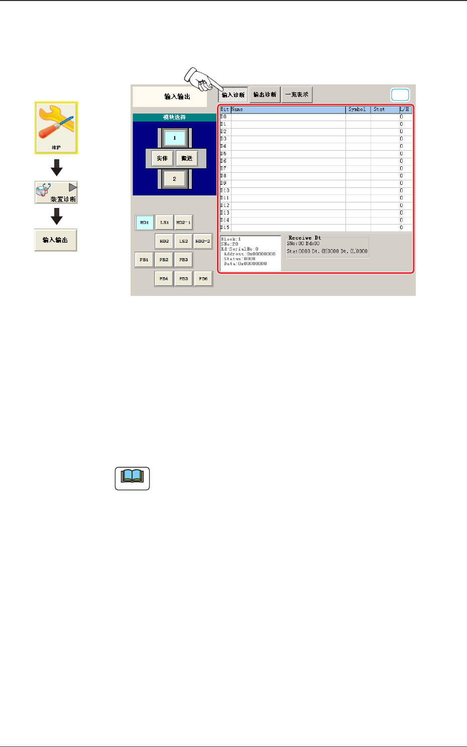 在装置的图像中显示的各模块被设为按钮。按下按钮,选择诊断 I/O