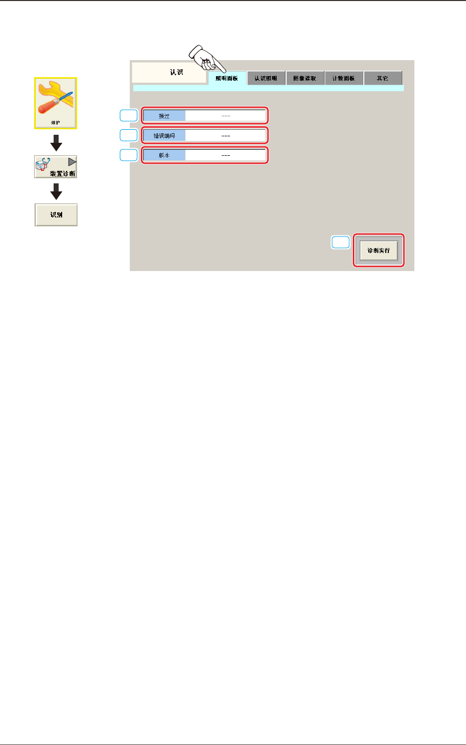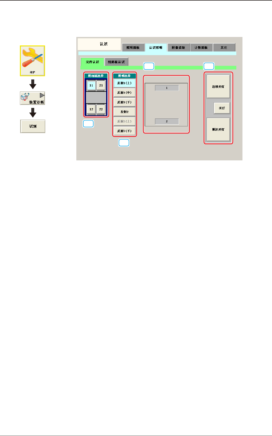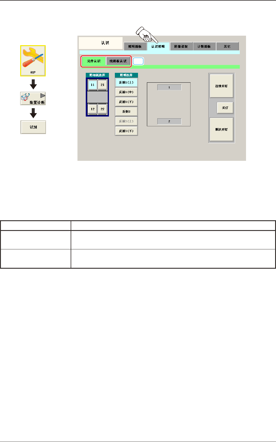 3OM-1732 1-6-19 6.3.2 认识 ( 识别 ) 照明 [1] Fig.3A6-25 [1]Tab “ 认识照明 ” 界面分为以下 2 个选项卡,按下 Tab,便显示各选项卡。 Table 3A6-8 Tab 内容 元件认识 ( 识别 ) 用最小单位开元件识别照明灯,确认接线状态和亮灯状态。 线路板认识 ( 识别 ) 开线路板识别照明灯,确认接线状态和亮灯状态。 界面展开 1209-002 6.3认识 ( 识…