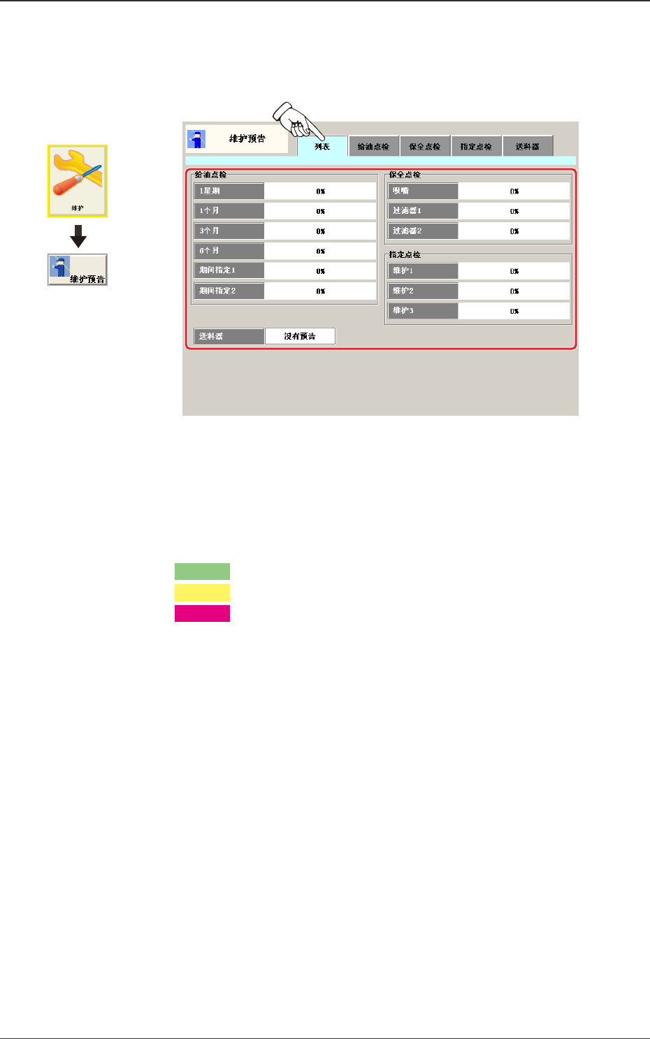 3OM-1732 1-7-3 7.1 列 表 在 “ 维护预告 ” 界面,按下 [ 列表 ]Tab,便显示以下选项卡。 Fig.3A7-2 “ 列表 ” 界面 用百分比 (%) 显示给油点检、保全点检、指定点检各项目的当前状况。 用百分比 (%) 显示的图表颜色根据状态而有所不同。  各颜色的区分方法如下 : 淡绿色  :0 ~ 69% 淡黄色 : 70 ~ 99%  粉红色   :100% 1209-001 7.1 …