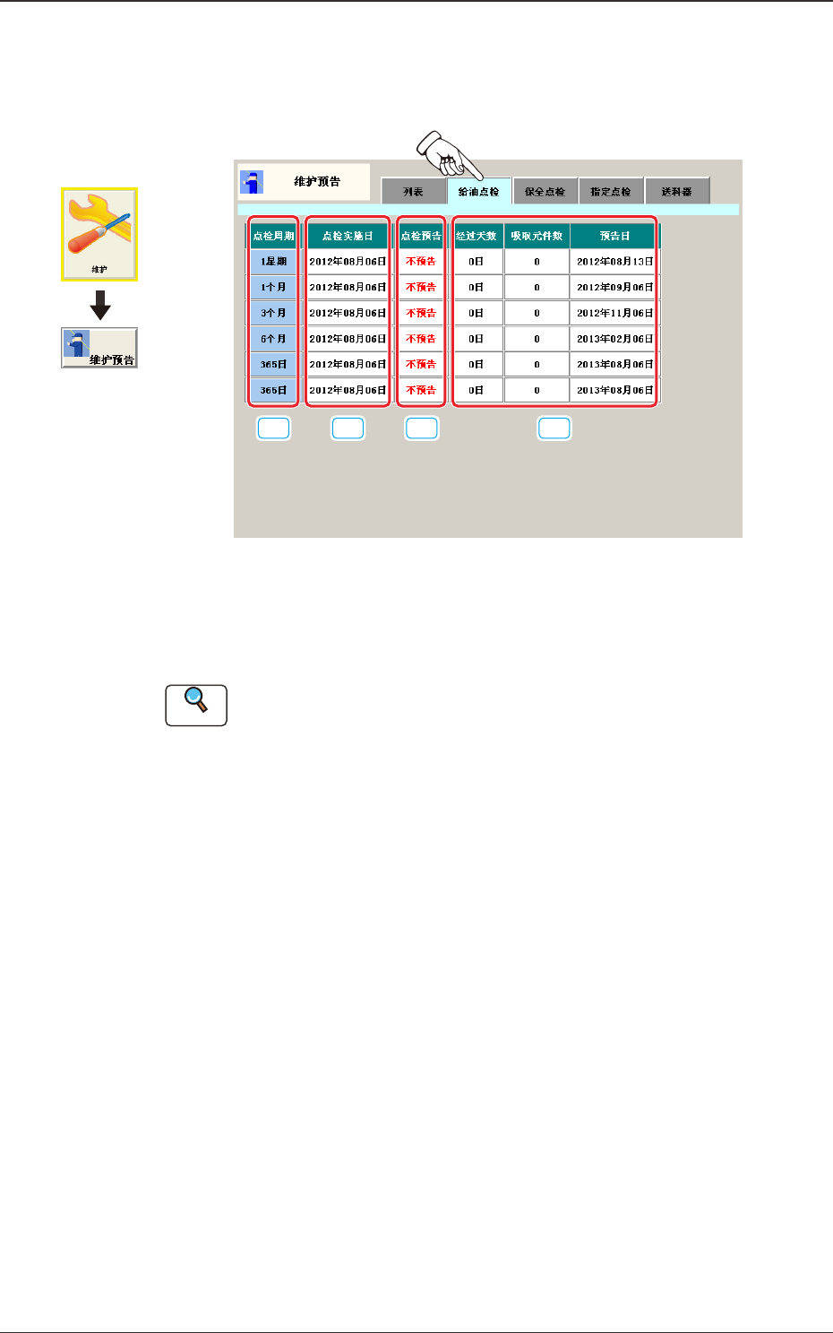 显示给油点检的维护周期 (1 星期、1 个月、3 个月、6 个月、365 ) 的实