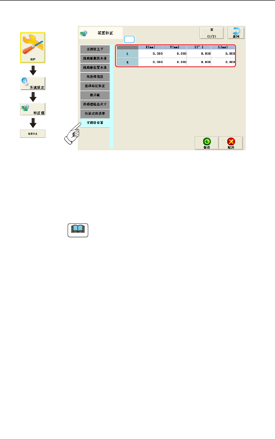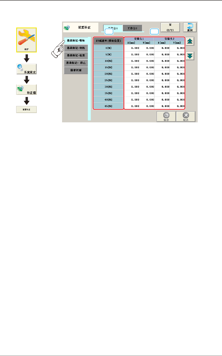3OM-1732 2-2-14 2.1.10 基准标记-吸取 [1] [2] Fig.3B2-14 [1] XY 减速率 [ 吸取位置 ] 0[%] ~ 45[%] 显示 XY 减速率。 [2] 安装头 1、2 X[mm]、Y[mm] 对从基准标记移动到吸取位置时 XY 减速率的安装头 X、Y 偏离进行补 正。 界面展开 1209-002 2.1装置补正 ( 补正值 )