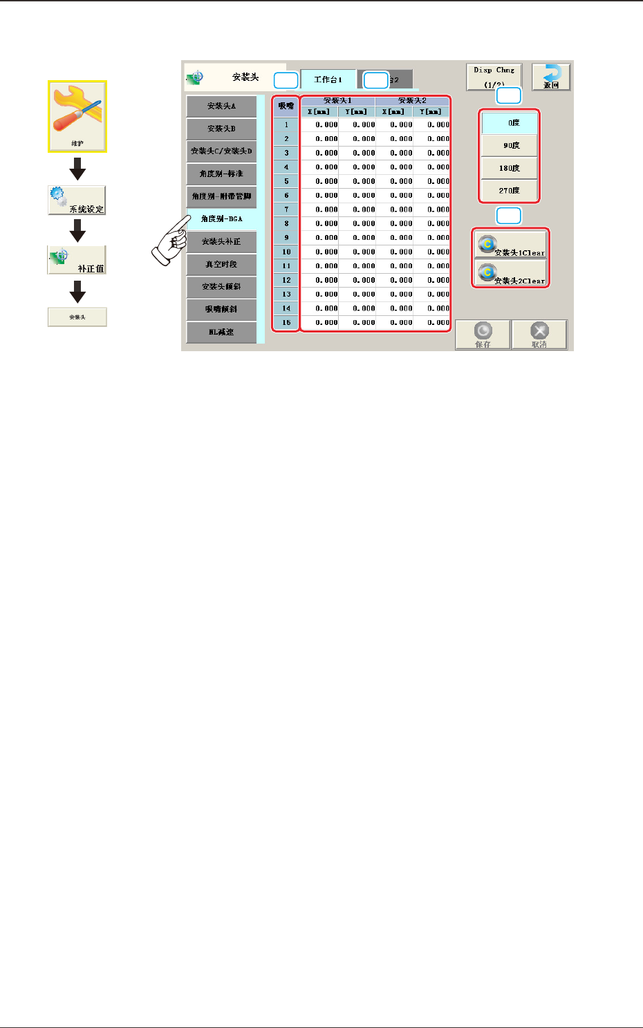 3OM-1732 2-2-33 2.5.6 角度别-BGA [1] [2] [3] [4] Fig.3B2-33 [1] 吸嘴 1 ~ 15 显示各吸嘴号。 [2] 安装头 1、2 X、Y[mm] 适用元件为 BGA/CSP 元件时,计算贴装目的位置时对应贴装角度被变 换、加算。 [3] 安装头方向选择按钮 进行每个选择角度的调整。 [4] [ 安装头 1Clear] 按钮、[ 安装头 2Clear] 按钮 清除安装头的…
