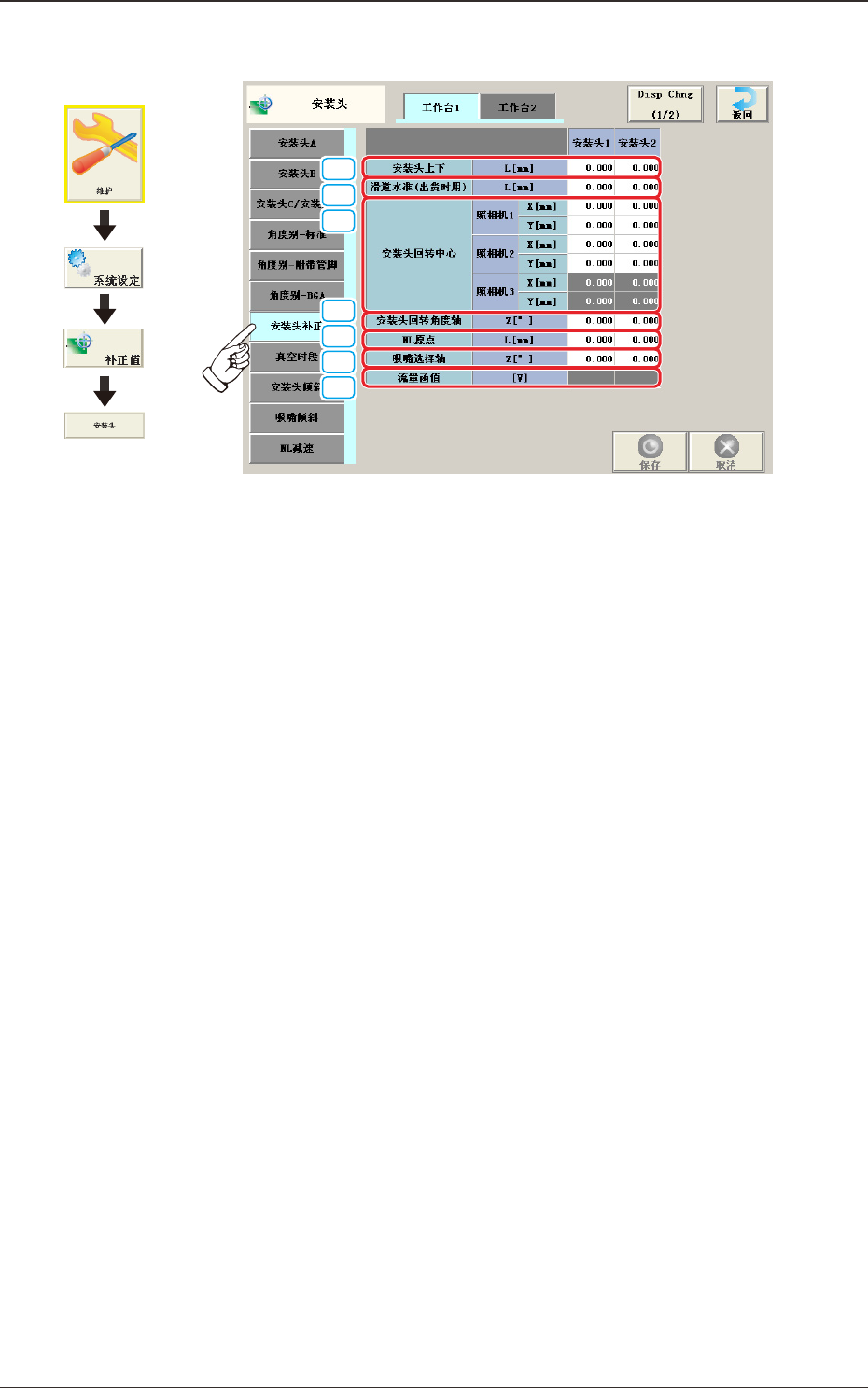 将主吸嘴贴装到安装头后,调整安装头上下轴、吸嘴上下轴两轴的复