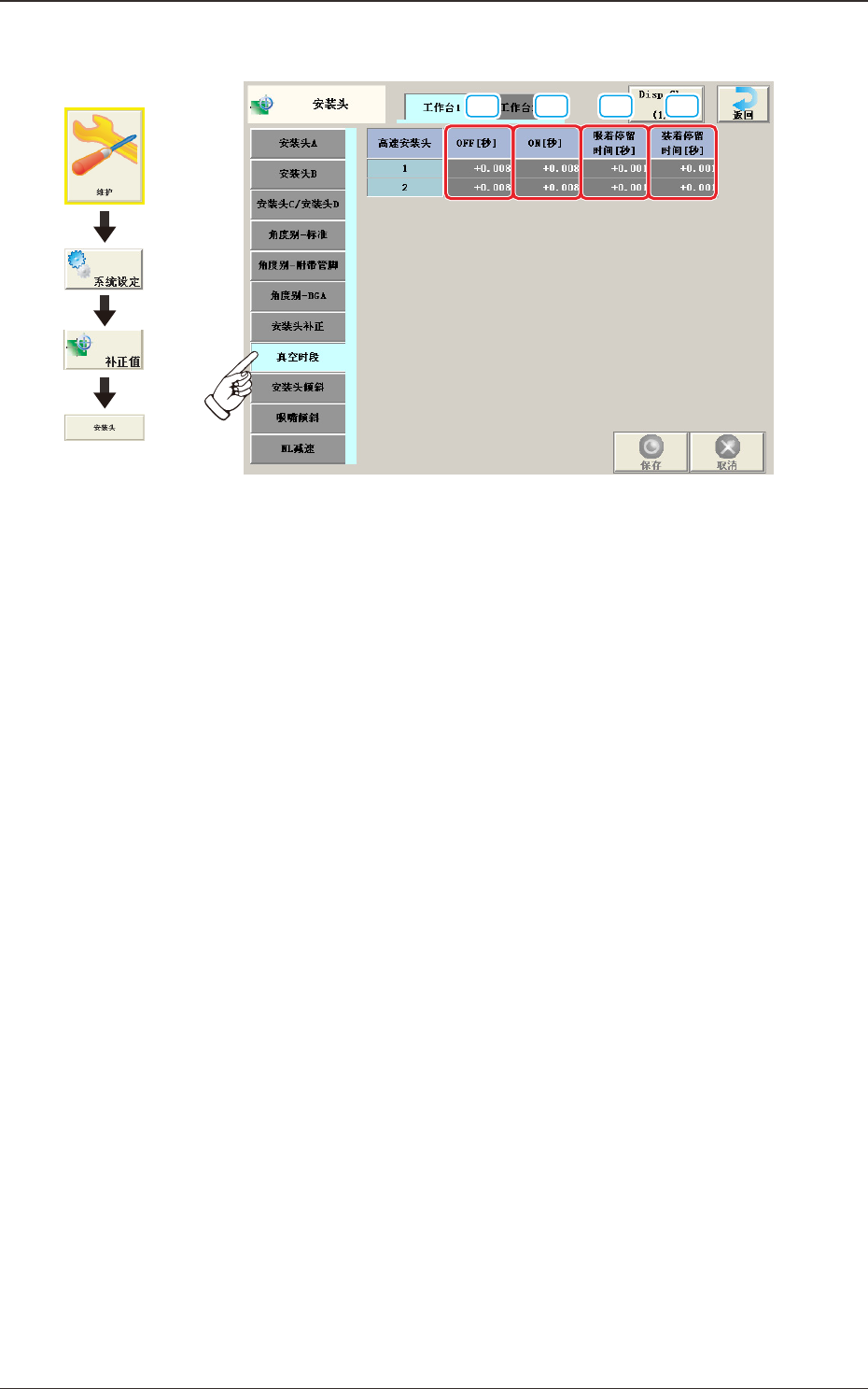 真空时段 ON 数据以到达 NL 轴下至点前 10ms 为基准,输入正值为真空