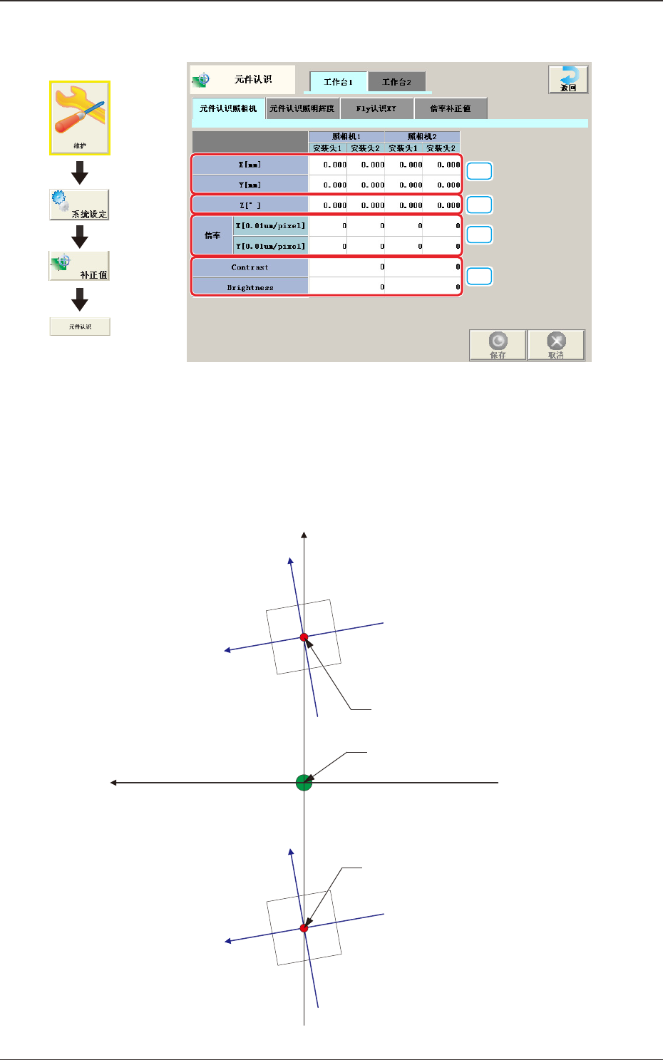 3OM-1732 2-2-57 2.9.1 元件认识 ( 识别 ) 照相机 [1] [2] [3] [4] Fig.3B2-57 [1] X( 横 )、Y( 纵 )[mm] 调整对装置基准坐标系原点到元件识别照相机中心的设计尺寸的位置 偏离。 Xm(+) Ym (+) Xm-Ym : 装置基准坐标系 Xc-Yc : 元件识别照相机坐标系 Xc(+) Yc(+) Xc(+) Yc(+) 元件识别照相机中心 元件识别照相机中心 Pm.装…