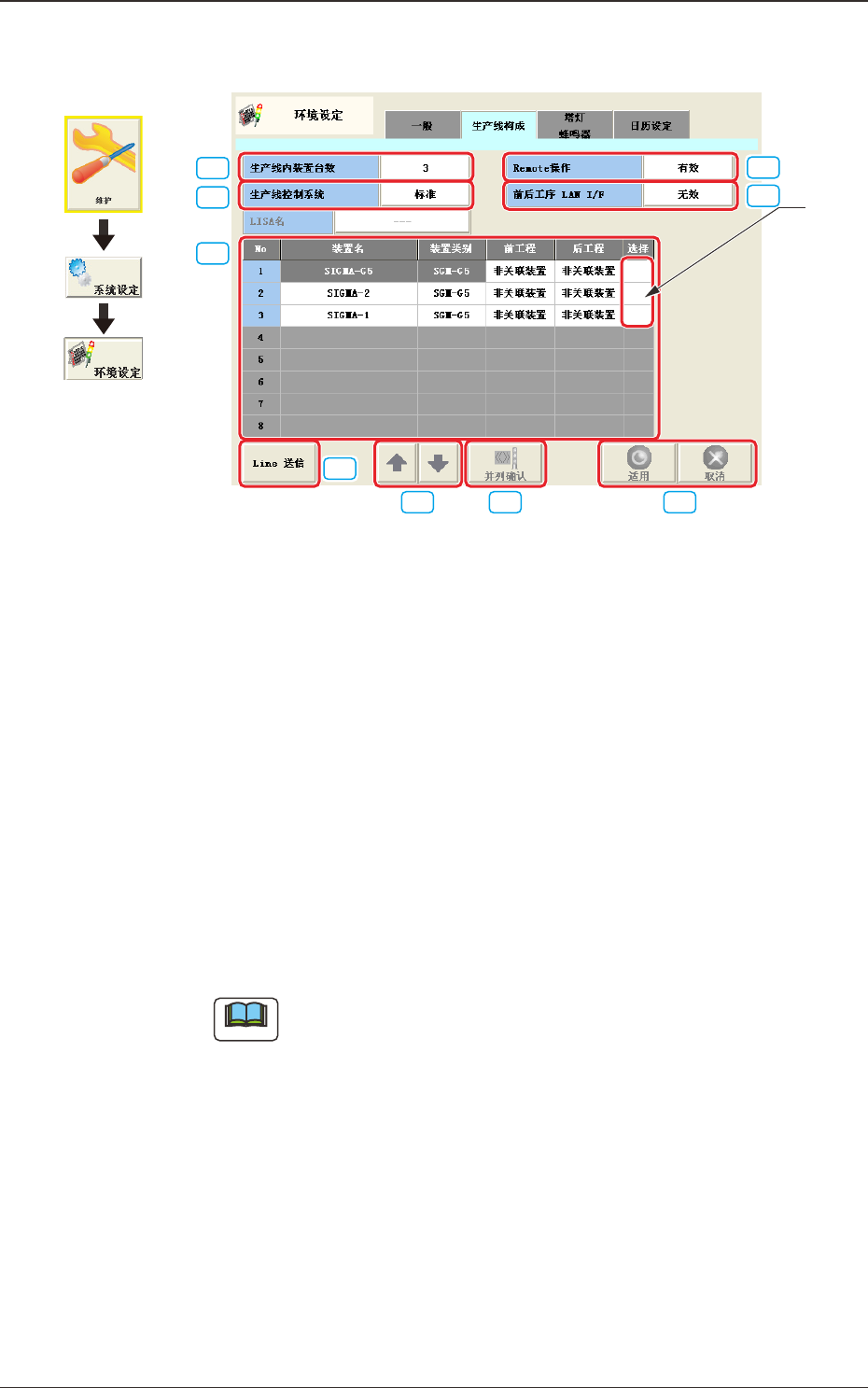 3OM-1732 2-4-5 [5] 生产线装置情报显示部 显示生产线构成。 装置名 设定装置名或 IP 地址。 装置类别 选择装置类别。 前工程 ( 工序 )、后工程 选择装置的前工序及后工序的装置是关联装置 (SIGMA 系列 ) 还是非关 联装置。 选择 选择进行装置重新排列的装置。 [6] [Line 送信 ] 按钮 将生产线构成设定送信到生产线装置。 [7] 重新排列按钮 重新排列装置。  请选择适用装置的移动单元后,按 […