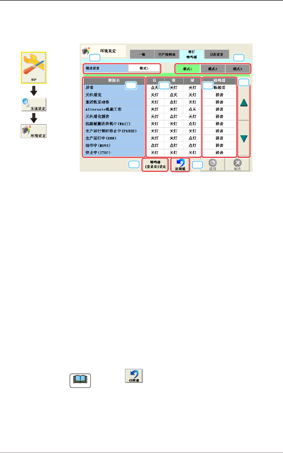 显示设定塔灯色 ( 红、黄、绿 ) 和警告音的项目。