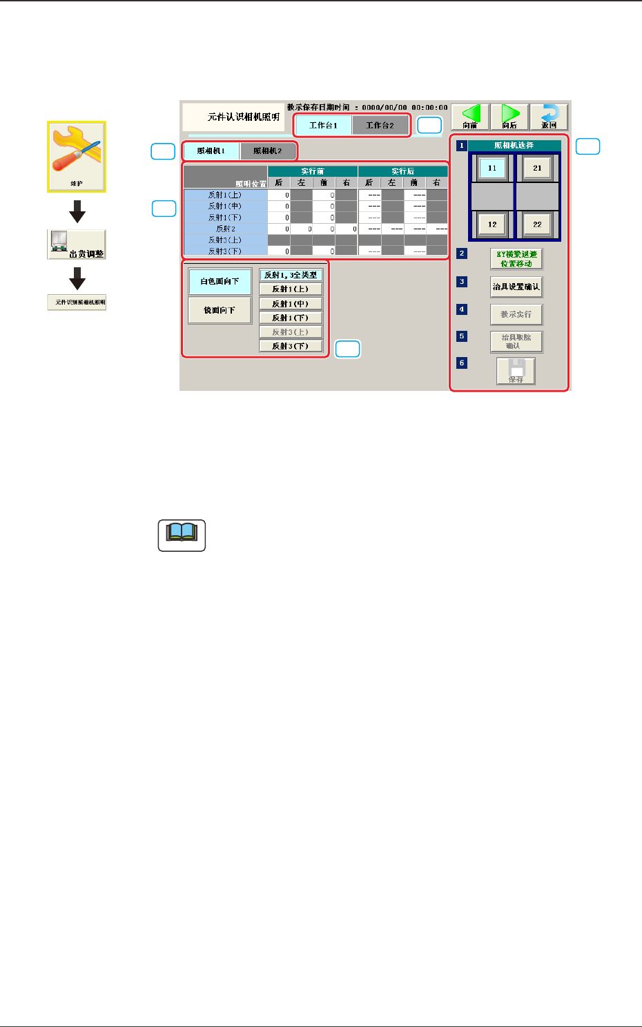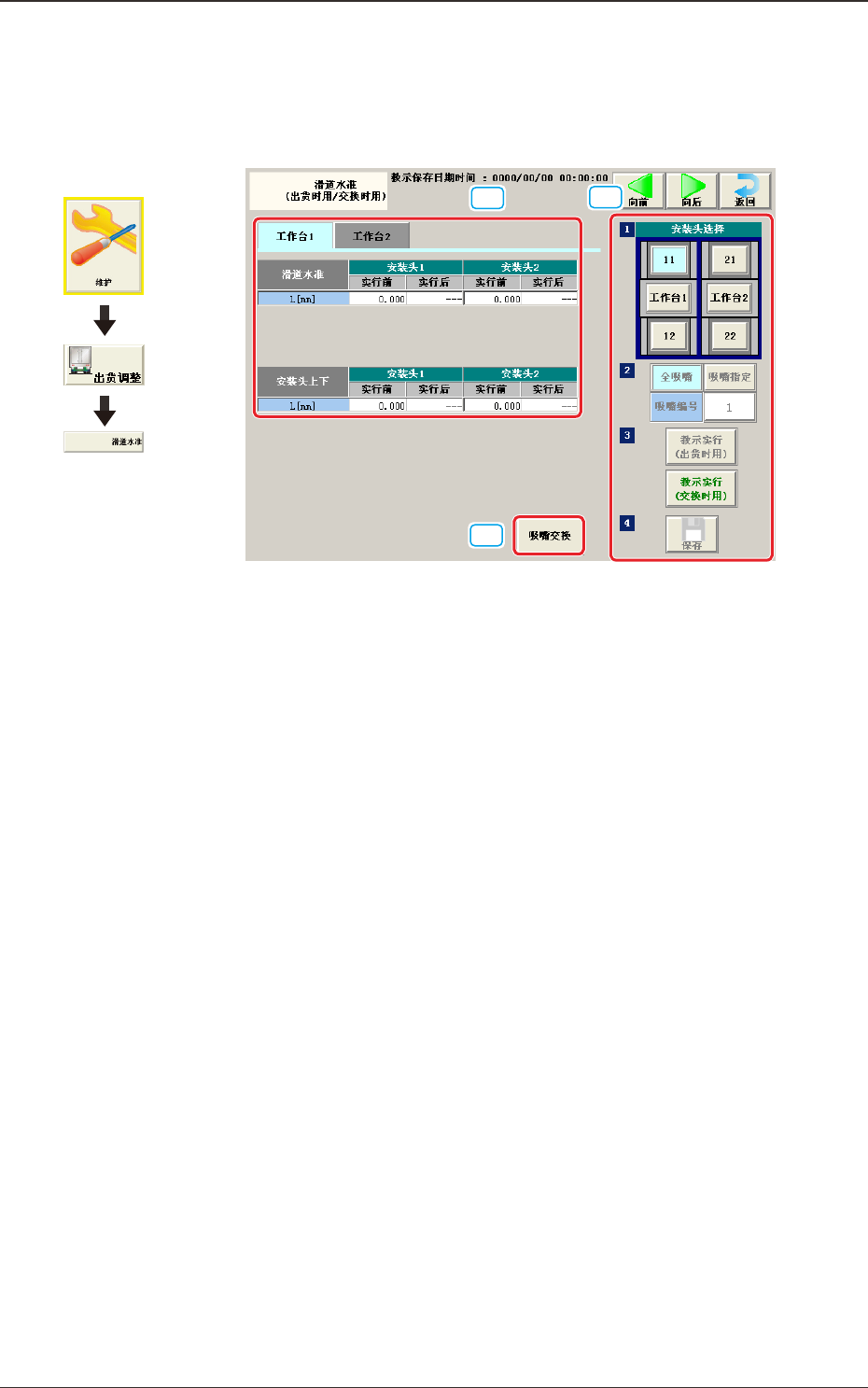 3OM-1732 1-5-6 5.3 滑道水准 ( 水平 )( 出货时用 / 交换时用 ) 更换安装头时,测定滑道水平,通过算出更换安装头前和更换安装头后的差 异,自动算出安装头上下补正值的教示功能。 [1] [2] [3] Fig.3A5-5 [1] 教示数据显示部 滑道水准、安装头上下 出厂前测定的数据显示在 “ 实行前 ” 中。 [2] [ 吸嘴交换 ] 按钮 交换吸嘴。 [3] 安装头选择 选择进行教示的安装头。 [ 全吸嘴 ]…