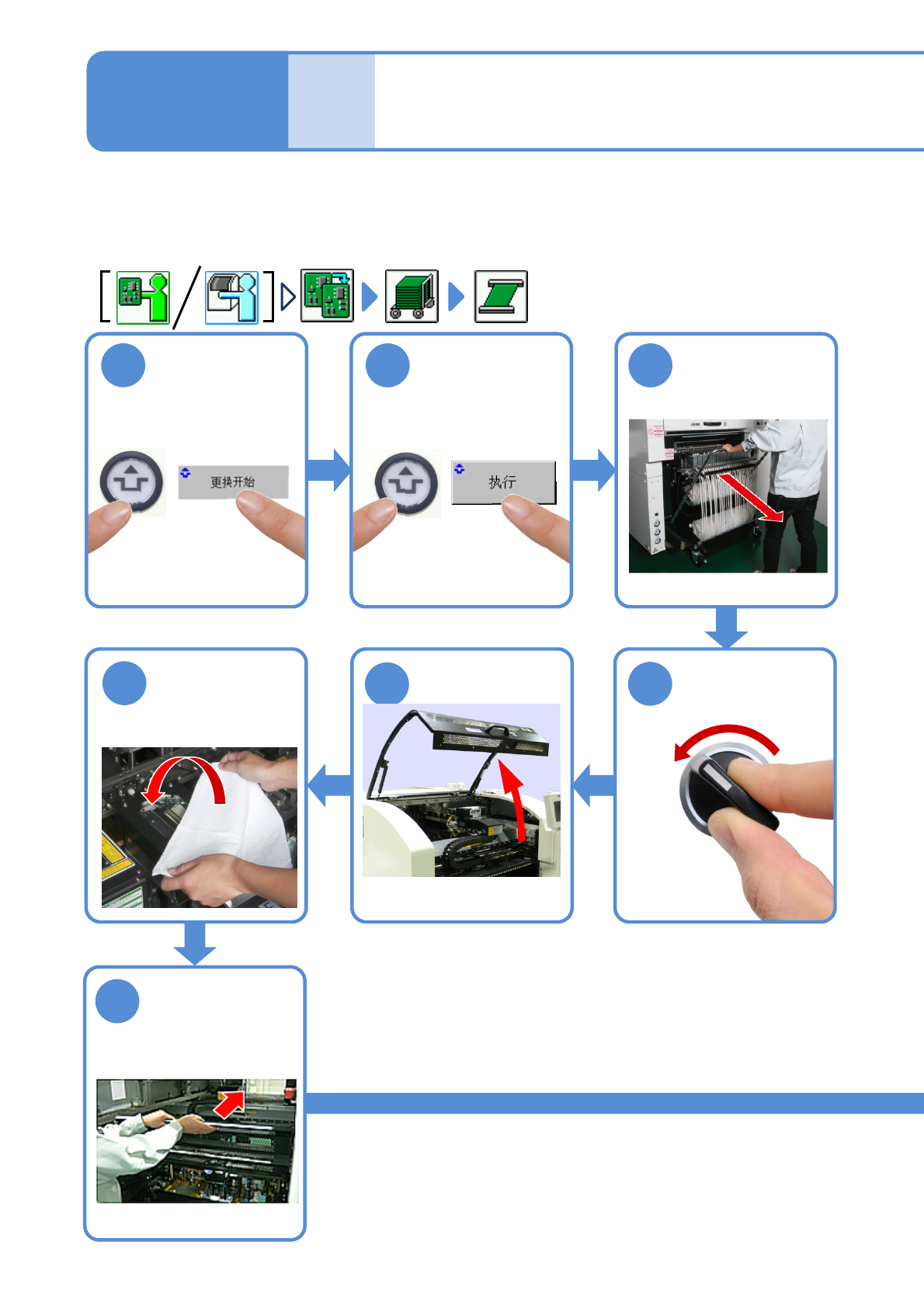 NPM-W 2 EJM7DC-MB-02O-1 0 ACTIVATION ACTIVATION OFF SERVO 个别 准备 2-5-3 -1 1 基板支撑销的安装 1 操作篇 2-5-3 卸下基板 2 3 卸下更换台车 (→ 『维修保养篇』 P.3-2) 5 4 7 6 把棉纱布盖到线 性照相机上 把供料器工作台盖 往内推 确认提示 在执行安装 / 拆卸基板支撑块的作业时,只有在 双传送带规格且后侧交换台 车规格设备的双轨模式下,从…