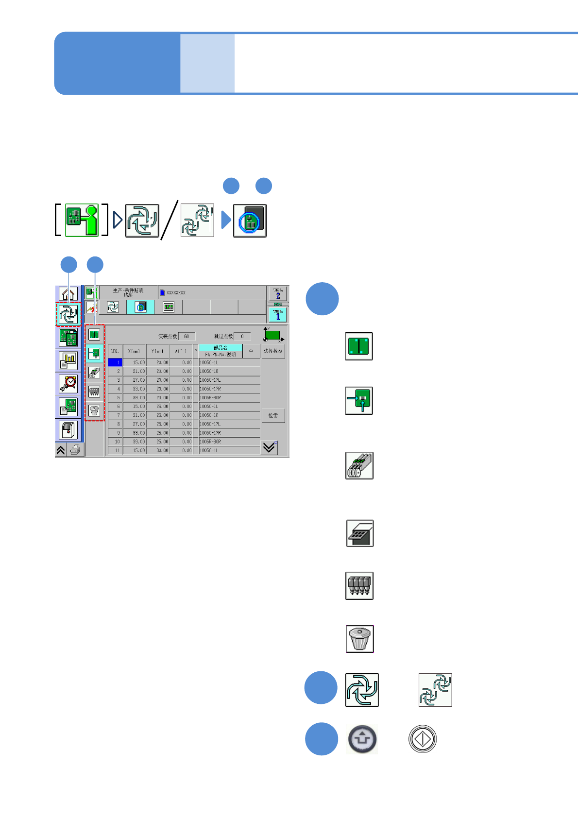 NPM-W 2 EJM7DC-MB-02O-10 2 1 1 2 选择图案 ●可以复数选择。 3 3 ●再按一次,选择就被解除。 E F C D I 2-5-6 -2 A E F G B C D I J H 图案张数 图案的总数。 跳过张数 指定跳过的图案总数。 No. 模式的 ID 编号。 ORG.X/ORG.Y 原点图案的 X/Y 坐标 BAD.X/BAD.Y 不良图案的 X/Y 坐标 R 图案的展开角度编号 PK 图案编号 H 通…