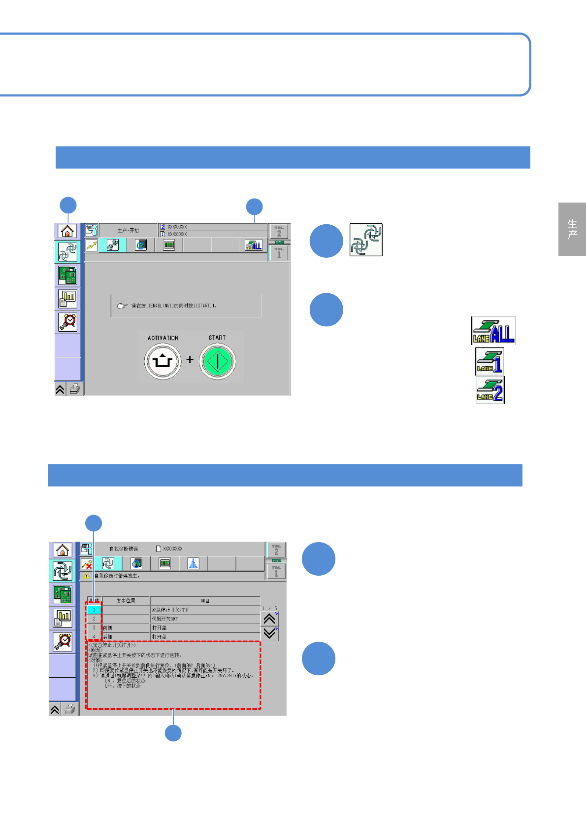 NPM-W 2 EJM7DC-MB-03O-0 6 生产 生产的开始 1 开始生产 3-1-1 -1 操作篇 3-1-1 对生产的开始方法进行说明。是操作 员的日常操作。 紧急停止开关是否已解除。 ●解除时,确认没有危险或者异常状 况, 把紧急停止开关往右转。 1 运转前的确认 传送带或者供料器工作台上必须 没有异物。 前侧、后侧的安全盖必须是 关闭状态。 1 2 3 5 进行自我诊断处理 4 ■有异常时, 显示异常项目。 ( → P.…
