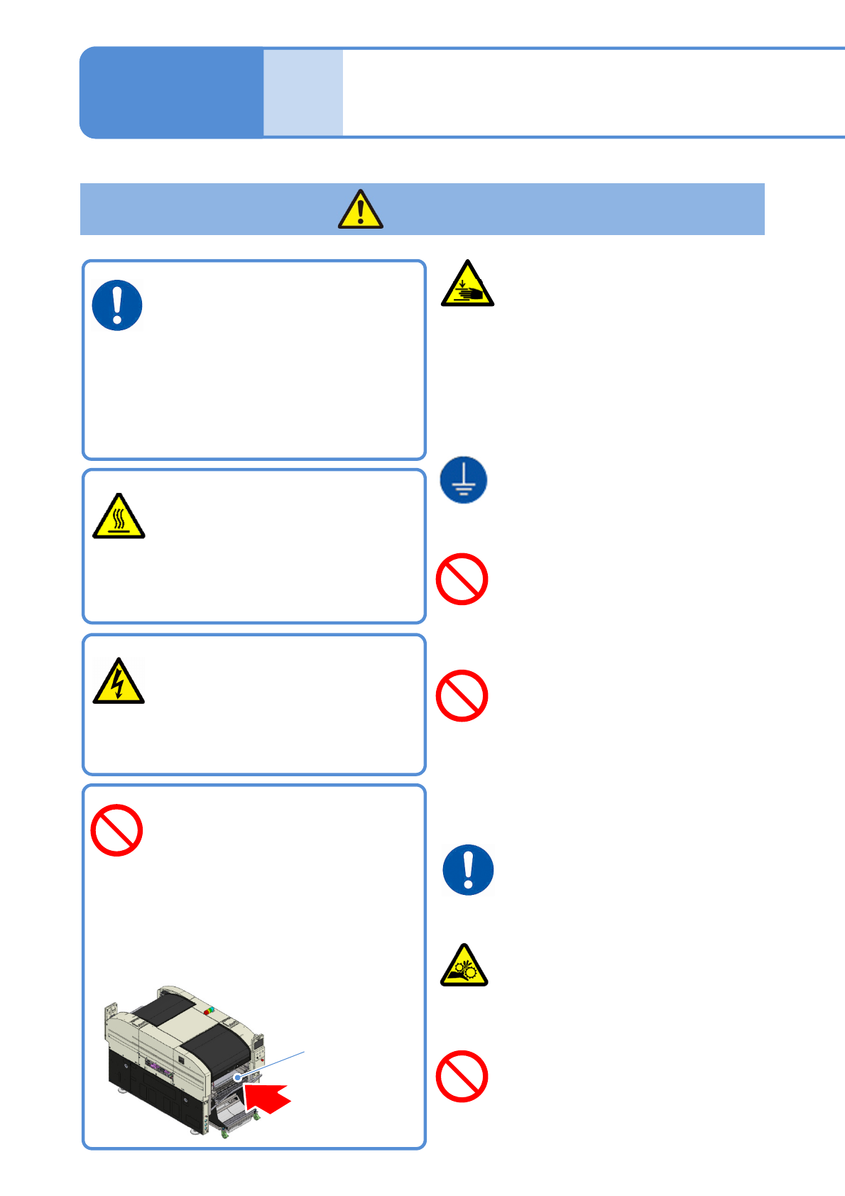 NPM-W 2 EJM7DC-SF-01N-0 8 警告 1-1 -6 维修保养时,切断主 电源 ( 可能受伤或触电 ) ●切断主电源,空压源也被切断。 ●请用锁把主电源开关锁住。 ●维修保养作业时,请挂上注意牌。 初级电路线 ( 持续供给电源 ) L1 L2 L3 PE 主接线端 主电源开关 维修保养时小心初级 电路线的触电 ( 可能触电 ) ●主电源即使是 OFF ,到主电源的初级 电路线为止有电。 请必须遵守 为了防止 受伤或触电…